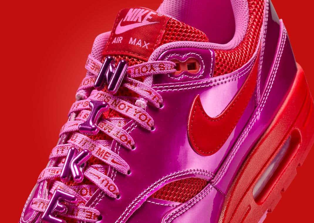 This design is showcased via the overlays and by the custom ballon-inspired lace dubraes that spell out Nike along the lacing setup. Also on the laces is a cliche phrase you don't want to hear on Valentine's Day — "It's not you, it's me" — in a font that mimics the one found on chalk heart candy. Matching the lettering are the red mesh panels along the toe and collar and the Nike branding in red on the midfoot and heel. Finishing the design is the red Air Max 1 midsole paired with a red and pink outsole.