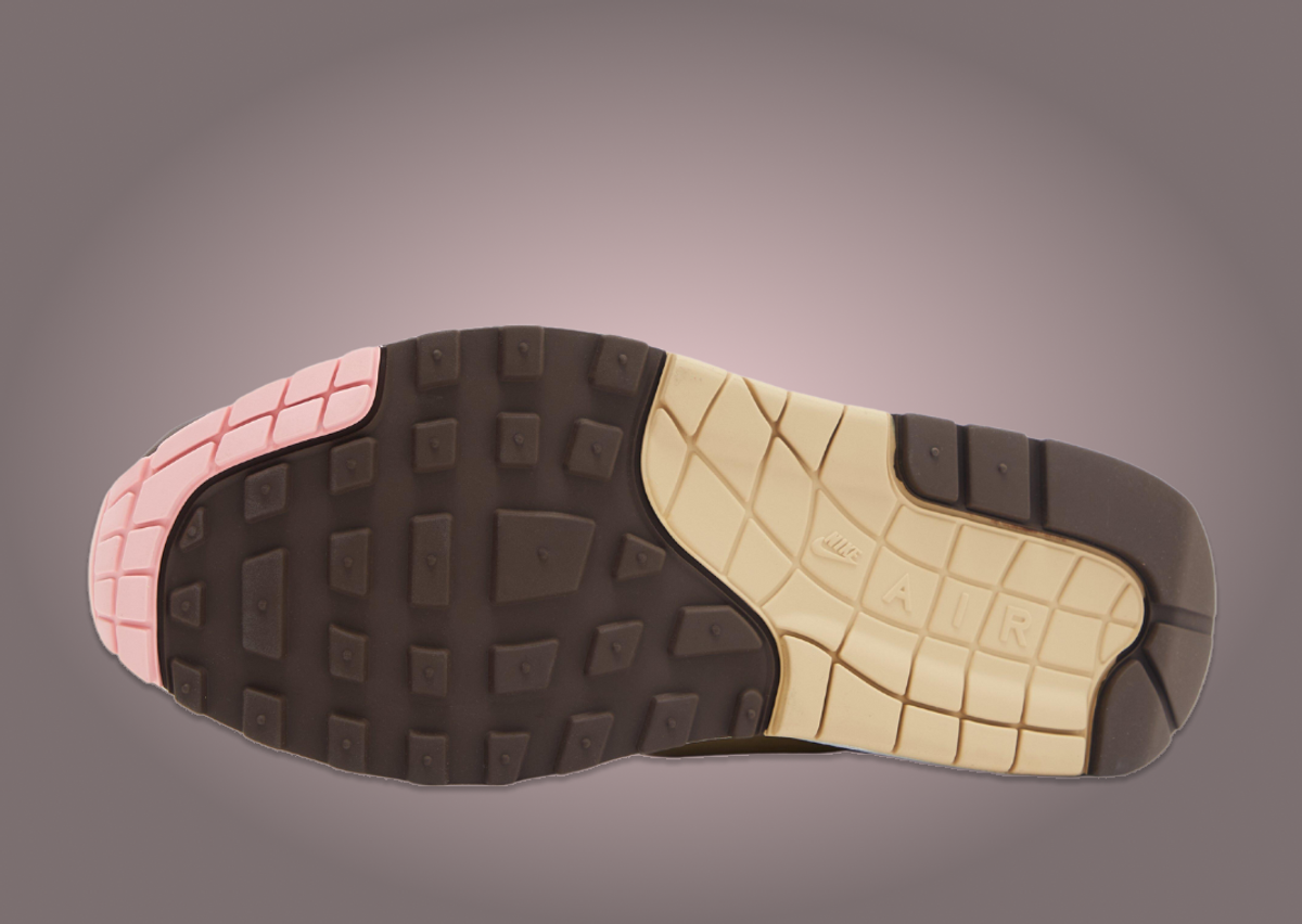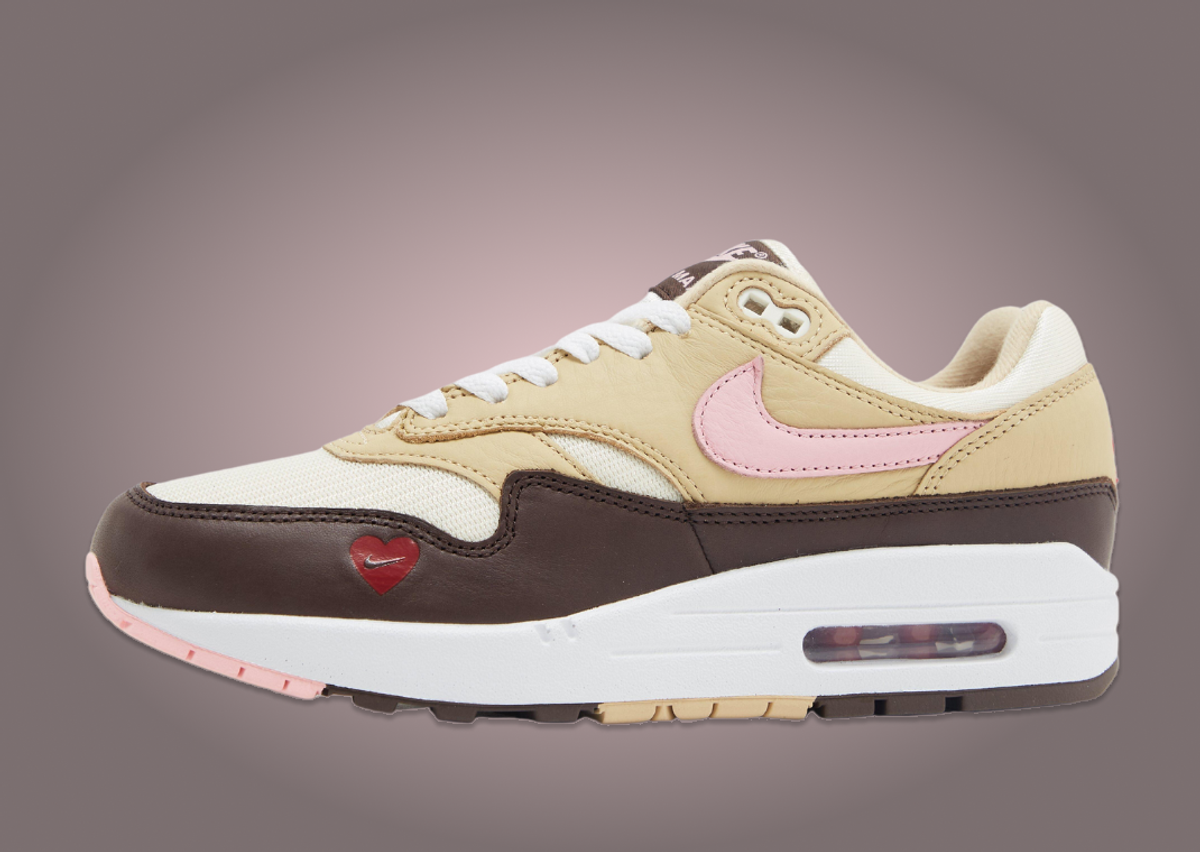 Rich in design and symbolism, the Nike Air Max 1 Valentine's Day manifests in a delightful Neapolitan-inspired color palette. Elegantly contrasting shades of cream, white, chocolate, pink, and red coalesce across the silhouette. The meticulous detailing is evident as chocolate brown dances around the mudguard, crowned by a heart enclosing a Swoosh on the lateral side. The mesh base, awash in a creamy hue, provides a sophisticated backdrop to the tan leather elements that sweep across the vamp, midfoot panel, and heel. Love is further expressed with a pink Swoosh that graces the ensemble, the pink Air Max branding on the brown tongue tag, and the fiery red Nike Air emblem at the heel. With a special heart adorning the insole and the classic white Air Max 1 midsole, the sneaker's design culminates in a multicolored rubber outsole, lending a harmonious finishing touch.