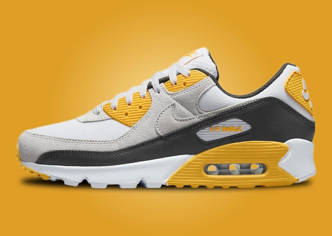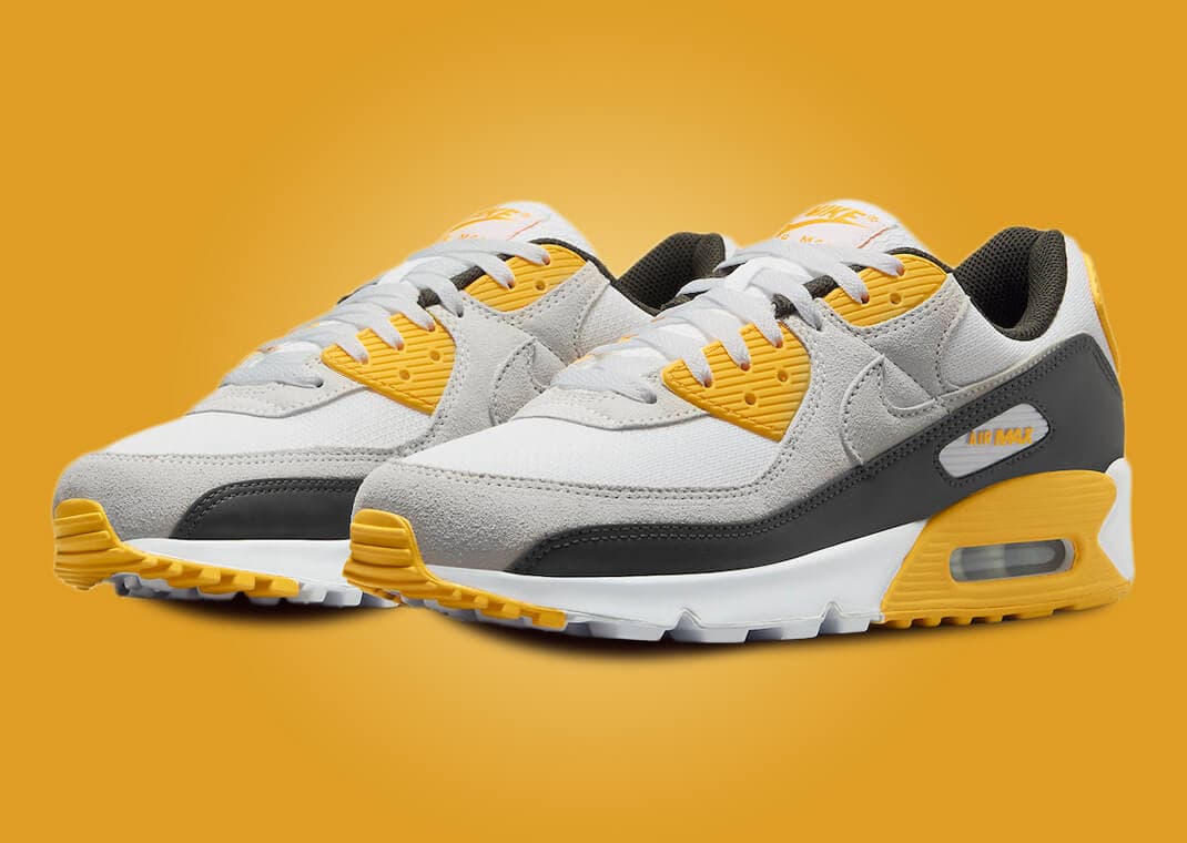 Up next for the Nike Air Max 90 is a clean "University Gold" pair. Featuring OG-style colorblocking, white mesh is accented by photon dust suede—a black leather mudguard on the sides and lining further the classic design. Instead of infrared, university gold accents are seen via the plastic eyelets, back heel tab, branding on the tongue and side heel badge, wrapping around the Max Air unity in the heel, and on the toe of the outsole. More white, via the laces, tongue, midsole, and outsole, complete the look for this Air Max 90.