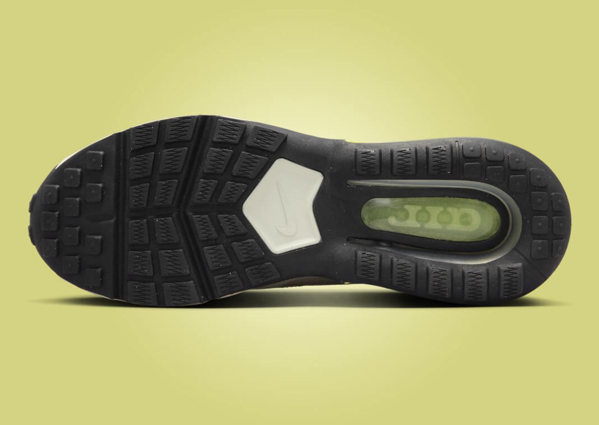 Transitioning to the rear of the sneaker, you'll find more light lemon twist, this time on the TPU heel counter with raised Nike branding, serving as both a visual focal point and a functional element for added stability and support. The midsole of the Nike Air Max Pulse Roam Stone is divided by an arch, distinguishing between the signature Max Air bubble located in the rear section and the standard midsole in the front.