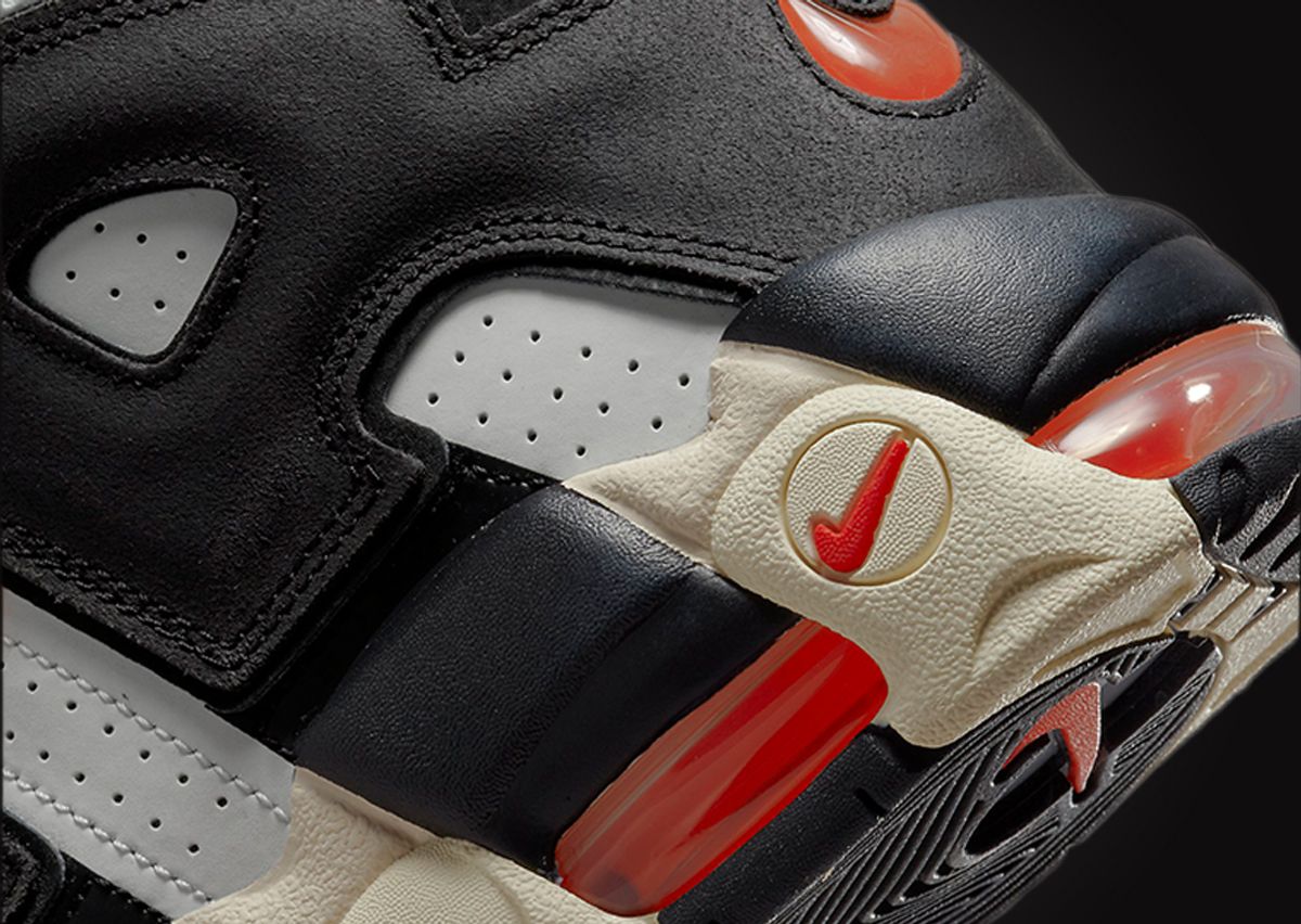 This Nike Air More Uptempo features a primarily photon dust-based upper in the usual soft-touch faux nubuck that the sneaker is well known for. Minor hits of orange outline the black Swoosh on the toe, the Swoosh branding on the top of the tongue, the jeweled Swoosh on the heel, and the mini Swoosh on the heel of the midsole. Stripes of black run down the upper, streaking down the midsole and across the tongue, by way of elastic lock-down straps. The “AIR” upper panels are composed of cracked black leather, with a small sail tab popping out of the “R” on the lateral side. Just underneath the pull strap on the heel is a basketball and a hand holding the peace sign. The sail midsole encapsulates the Air unit, which features columns of bright orange.