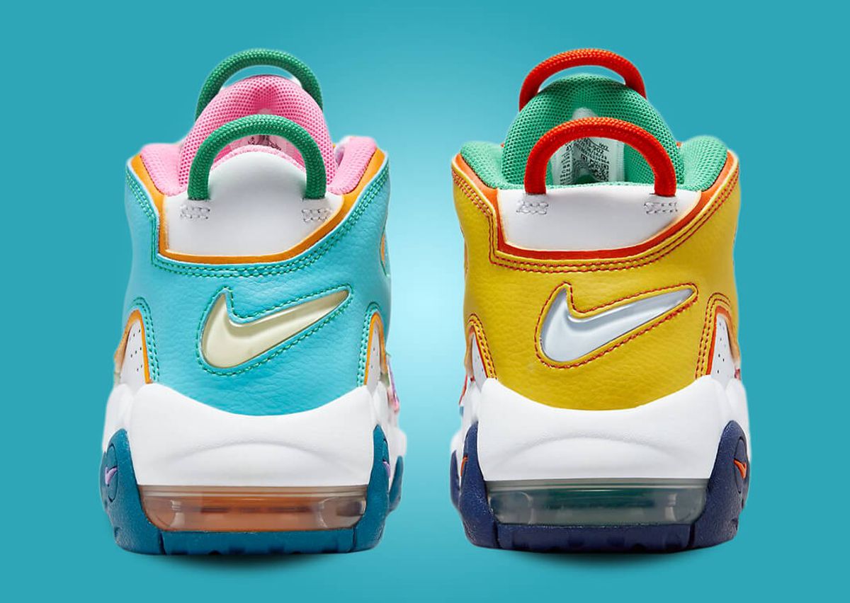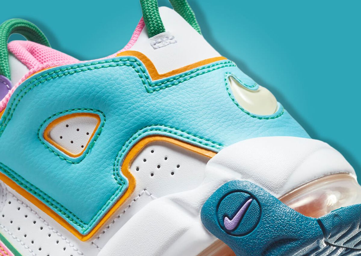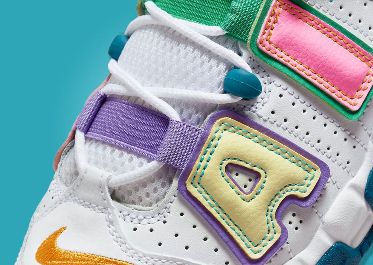 This fresh twist on the Air More Uptempo adopts the eclectic "What The?" theme, which Nike currently applies to the Dunk Low and Air Force 1 Low. Predominantly white leather characterizes the base, serving as a blank canvas for the eruption of colors that follow. The iconic "AIR" lettering adorning the shoe gets a vibrant treatment, with each letter and surrounding panel brandishing different shades, creating a playful mismatched look. Adding to this mix are different hues on the sockliners, pull tabs, and even the bungee lace loops. The sole doesn't remain untouched by this color explosion; the left and right sneakers have blue and navy finishes, respectively. To top it all, the visible Air units beneath also alternate in colors, perfectly encapsulating the theme.