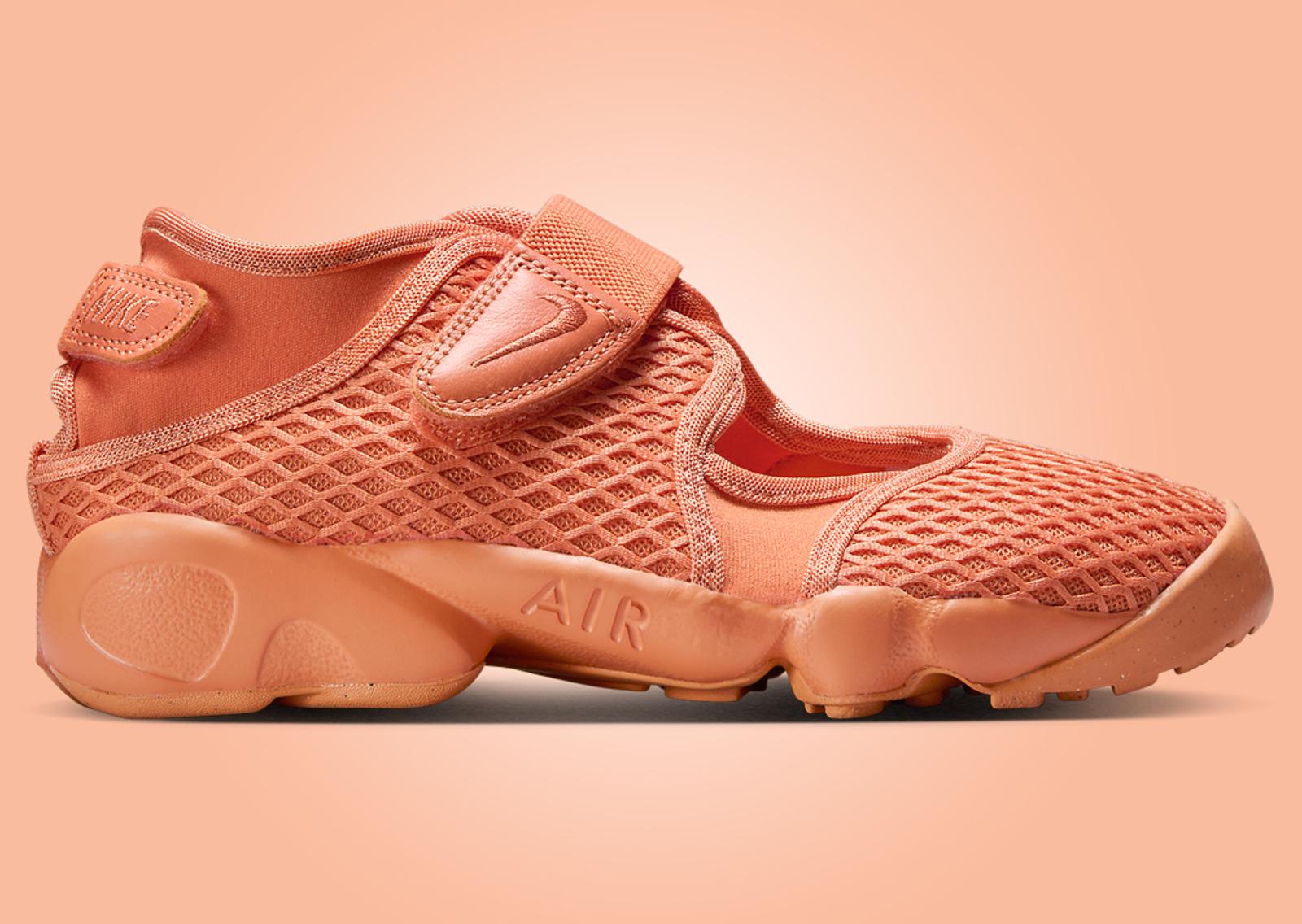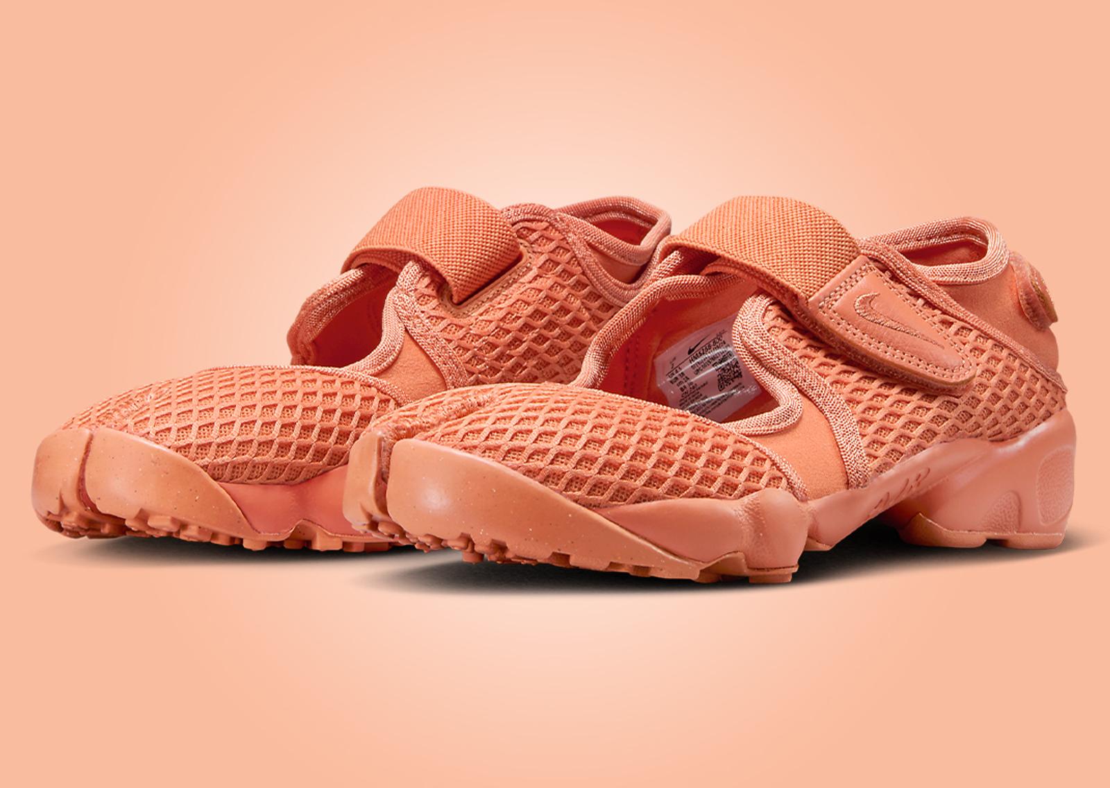 The Breathe Pack includes three women’s exclusive versions of the Nike Air Rift: one in Healing Orange, another in Black, and a third option in Light Orewood Brown. Each pair comes coated in a monochromatic color palette in the titular hue, covering the mesh paneling around the toe and midfoot, the terrycloth base, and the canvas strap. On the end of this strap along the forefoot is a leather patch hosting an embroidered Nike Swoosh, with a similar design found on the heel.