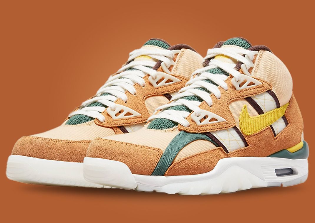 Coming in an earth-toned color palette, the Nike Air Trainer SC High “Outdoor” colorway is represented with the uses of sandy tans, browns, and green across the upper. The base of the model comes in a tan canvas surrounded by brown suede overlays. Hits of green are present on the canvas overlay across the toebox as well as the shaggy tongue. Across the midfoot, two stripes are present with brown piping that works its way up to the plastic eyelets, providing lockdown support. Yellow corduroy Swoosh logos on the sides are accented nicely by the yellow contrast stitching seen on the stripes on the sides. Working down to the midsole, an almost entirely white Phylon midsole is broken up by hits of the same green and yellow used on the upper towards the heel portion. Completing the look is a whited-out semi-translucent rubber outsole.