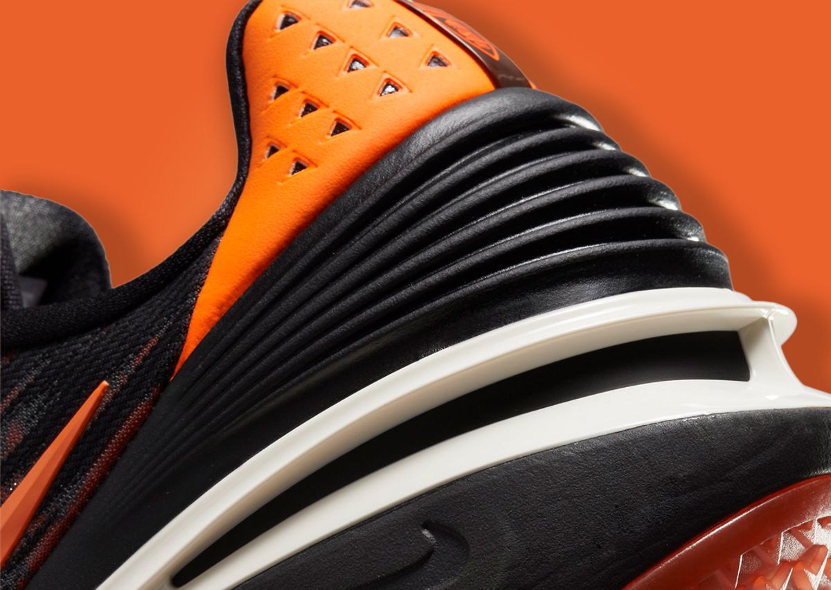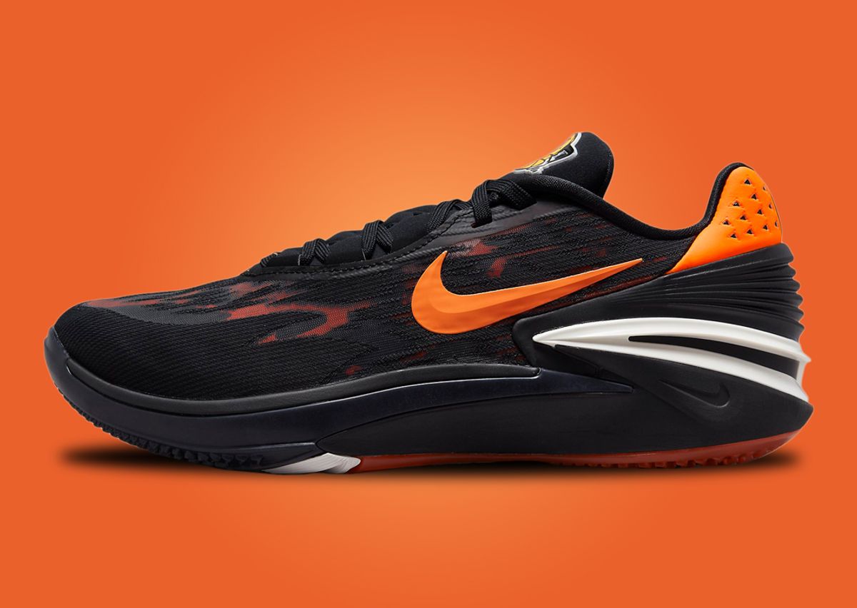Taking on a shades of black, orange, and white, the majority of the engineered mesh upper takes on darker shades of black while portions of the knit pattern are semi-transparent and reveal an orange pattern below. Black-on-black shades take over the tongue and lace set while the tongue tag replaces the usual Nike branding in favor of a fictional mascot featuring a Nike Swoosh for his mouth. Along the midfoot, you’ll find a TPU Swoosh in orange that stops just before the orange heel tab and a two-tone black/white TPU heel counter. More Nike branding on the insole continues the fictional team motif with “Nike University” text against an orange backdrop. Underfoot sits a Zoom Air unit in the heel with a full-length Zoom Strobel unit and React foam insole paired with a grippy wiper-blade patterned rubber outsole.