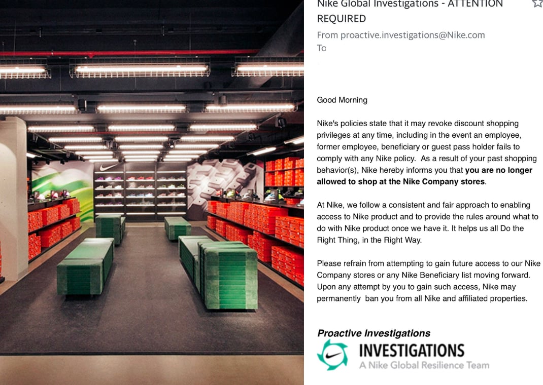 In the aforementioned email, the Investigations Department at Nike informed an individual that “As a result of your past shopping behavior(s), Nike hereby informs you that you are no longer allowed to shop at the Nike Company stores.” These Company Stores allow Nike employees, their friends, and those on a Nike Beneficiary list to purchase products at a discount from their typical retail prices - essentially a dream for someone who is looking to resell products or game the system by adding on extra coupons to the deeply discounted products offered at these locations.