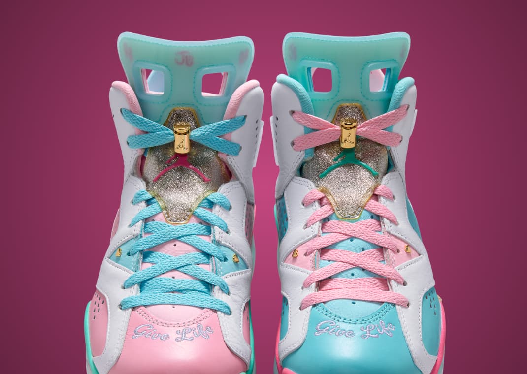 When Jillian Beagly was an infant, she was diagnosed with a rare liver disease that required her to have a liver transplant when she was 11. Now, at the age of 14, Jillian is playing the game of basketball for her school, winning a state title in the process. For her Air Jordan 6, she adds interchangeable patches, heart-shaped perforations, and a pastel color palette to MJ’s sixth model. Aside from the white leather staying the same on each pair, we see mismatched colors used on the underlays, laces, heel spoiler, and sole unit, a nod to Jillian’s love of wearing mismatched Jordans on the basketball court.