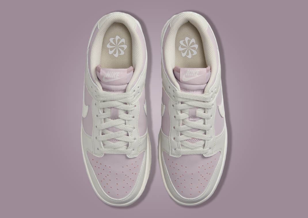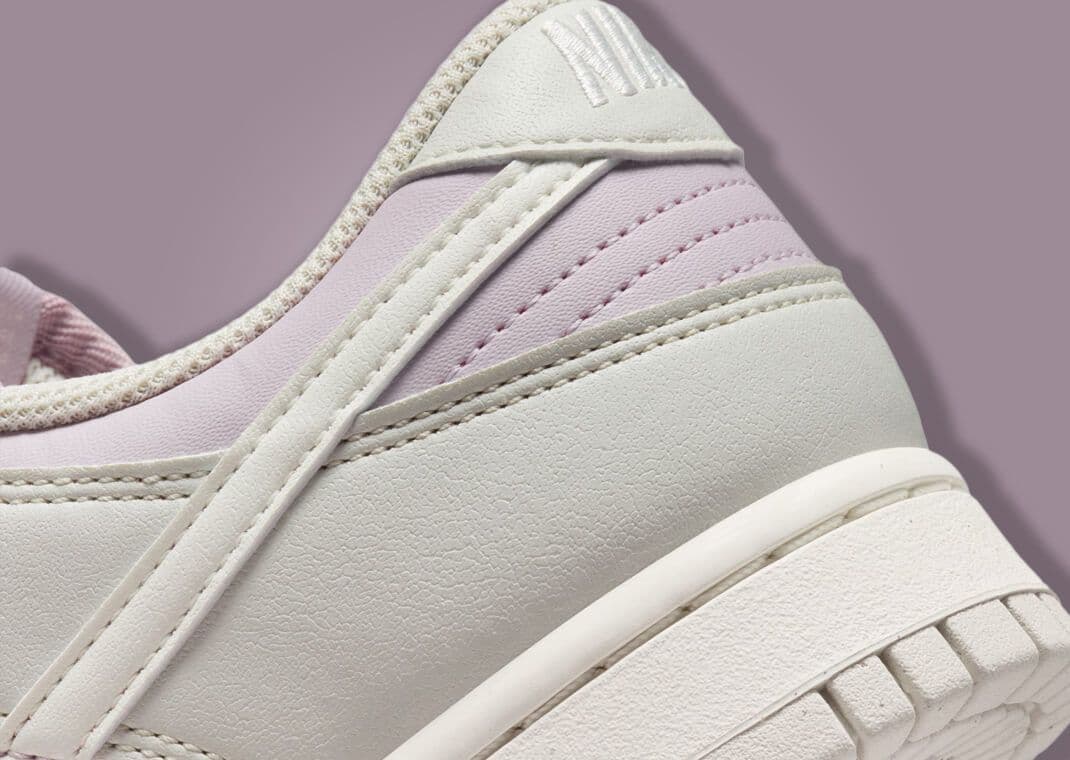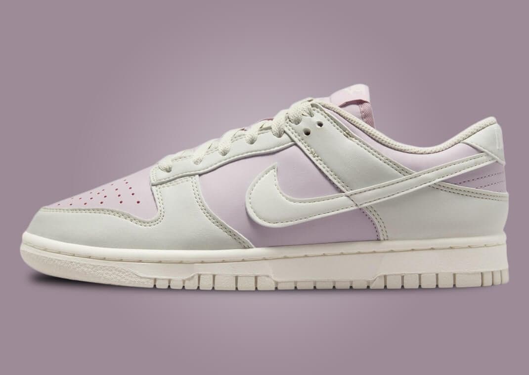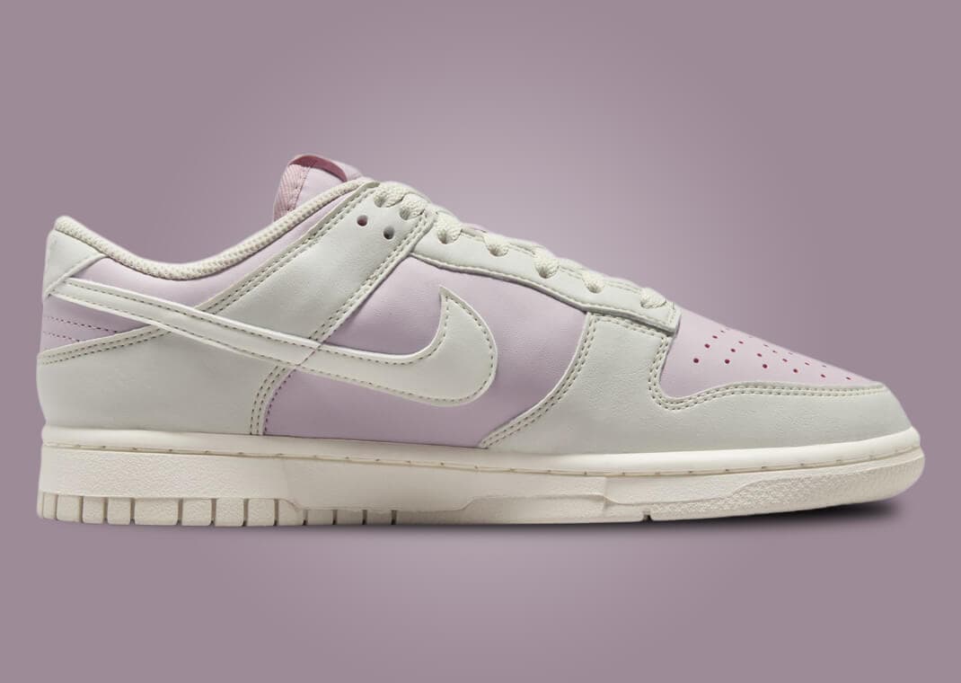 This Dunk Low beautifully balances its contrasting shades. Platinum violet gracefully adorns the toe box, quarter panel, collar, and tongue. In contrast, the light bone hue seamlessly integrates with the mudguard, eyestays, lace set, heel, and the iconic Swoosh, bringing a serene balance to the design. The branding detail on the tongue tag is elegantly presented in light bone, while the heel tab comes alive with the "Nike" embroidery in a matching violet shade. Perfectly rounding off the design, a sail-colored midsole is juxtaposed with a vibrant violet rubber outsole.