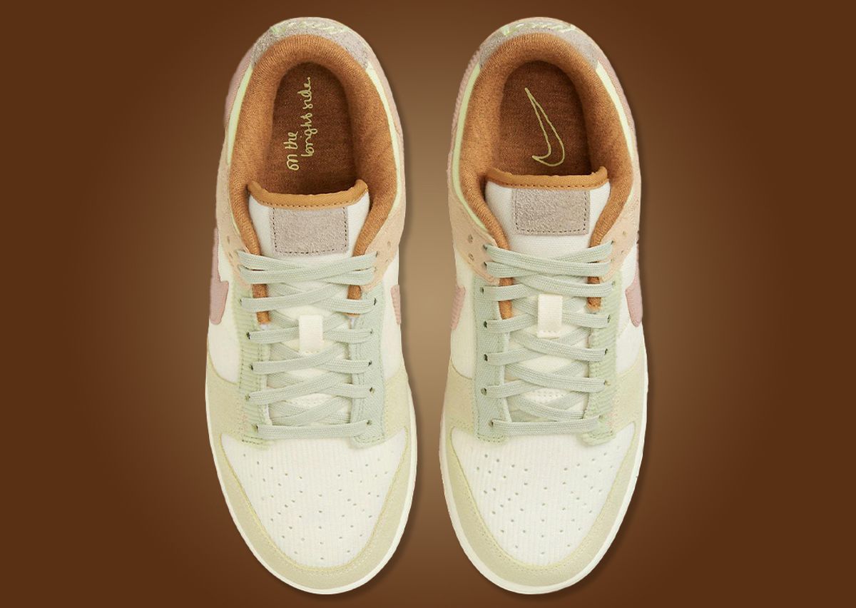 As previously mentioned, the “On The Bright Side” is filled with Spring-friendly pastel shades. The overlays in suede and canvas feature muted salmon, green and yellows with a hazy orange surrounding the sock liner. Along the lateral side, denim patches sit atop the cream corduroy base and salmon overlays in cloud-like patterns. Floral motifs make it onto the heel counter with loose threading hanging off. More prominent “On The Bright Side” branding appears on the left insole.. Rounding out the look, a cream colored midsole accented by light brown stitching sits above the brown Nike Grind outsole.