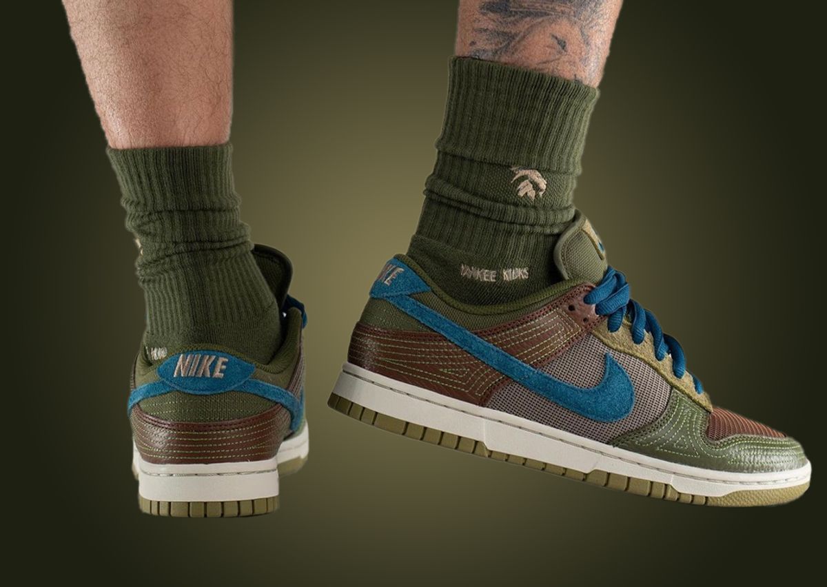 Using a color palette similar to the Concepts x Nike Dunk High “Turdunken,” the entire upper comes in shades one would find on a Mallard duck. Switching up the standard materials, a mesh base sits below leather and suede overlays. Starting down at the brown mesh toe box, a green tumbled leather mudguard with contrast stitching throughout compliments the hairy green suede on the eyelets.