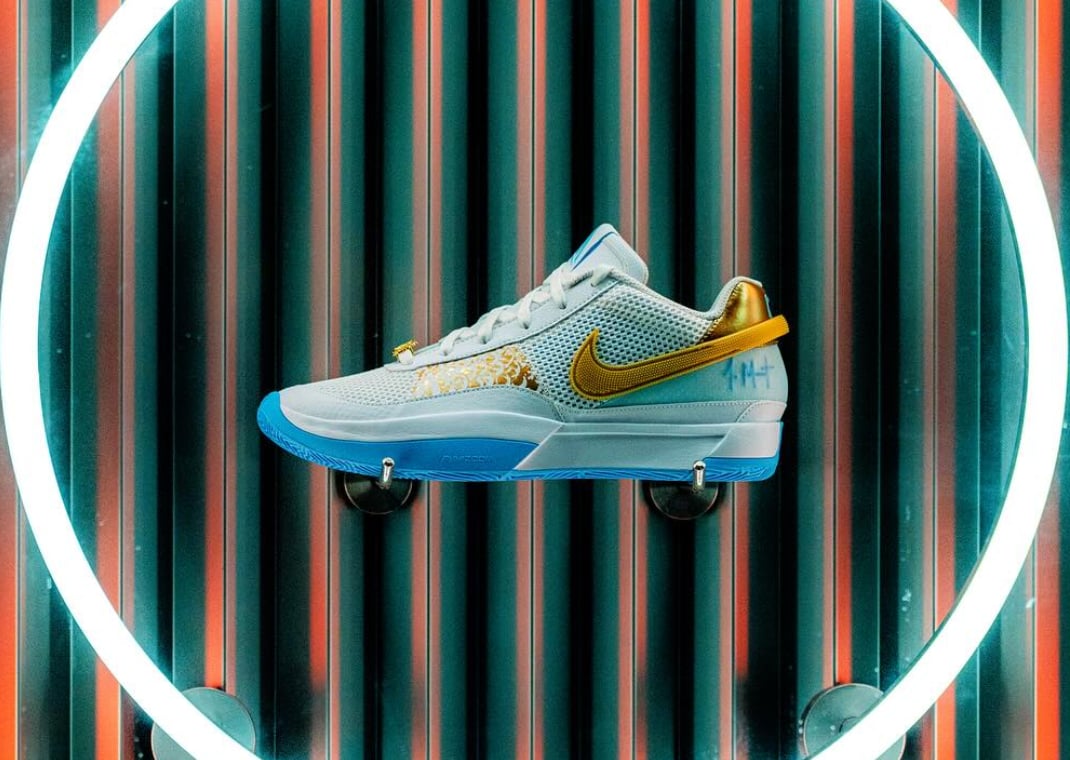 This Nike Ja 1 embodies elegance and celebration. A pristine white hue dominates the sneaker's upper, gracefully coating its mesh, leather, and ripstop panels. Yet, it's the gleaming golden accents that genuinely capture the spirit of the occasion. These golden touches highlight the textured Swoosh, heel tab, lace dubrae, and an intricate midfoot reinforcement pattern as a tribute to Morant. His signature "TMT" branding is placed on the lateral heel beneath the ripstop section, rendered in a striking blue. This blue shade also graces the tongue tag's logo, harmoniously blending with the design. For the performance aspect, the sneaker boasts a white and blue Air Zoom-cushioned midsole complemented by a durable blue rubber outsole.