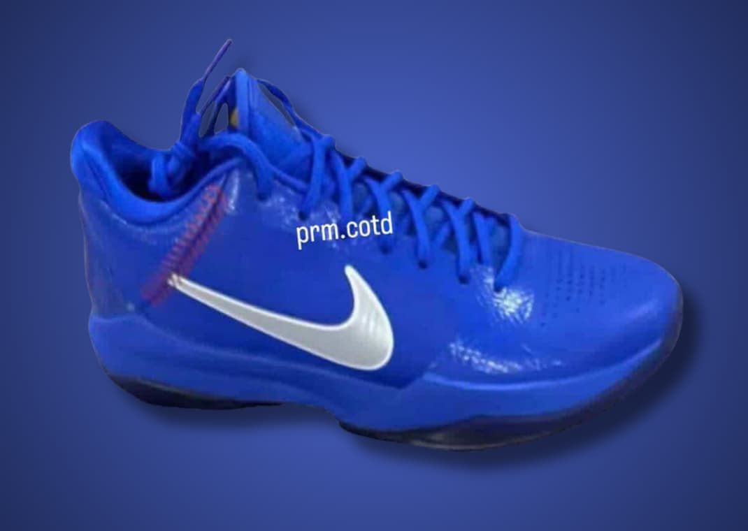 The Nike Kobe 5 Protro Dodgers has been in the on-deck circle since last winter, when we first got word the pair was being called up. Now, after drawing up speculation last year, a single leaked photo of the colorway shows a bright blue upper with red baseball stitch accents that looks very similar to our original mockup.