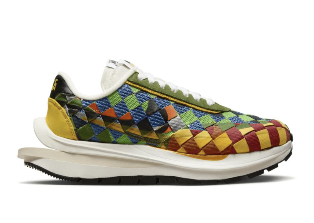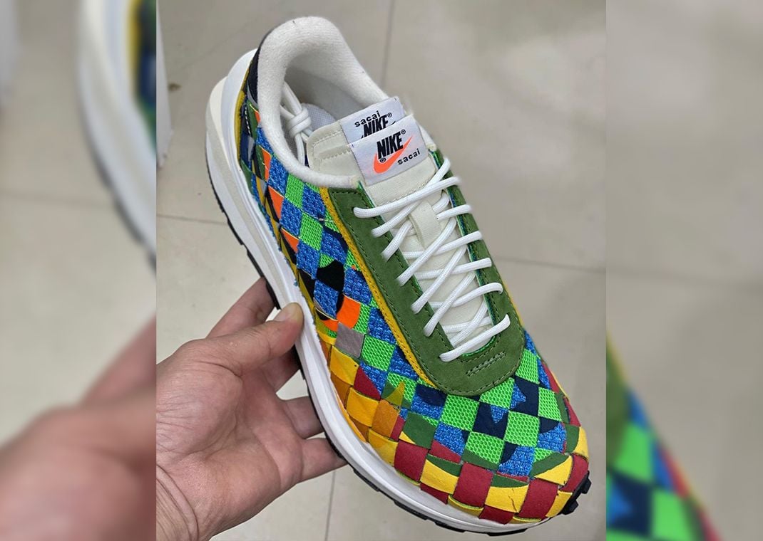 While the sole unit below comes in the classic doubled-up construction from the OG LD Waffle, sacai updates the upper of the model with a multi-color mixture of woven materials. Leather and mesh are woven in a combo of green, red, yellow, and brown near the mudguard and between the upper and sole unit while the base layer features a green mesh spotted throughout the checkerboard design. Suede eyestays host a set of white rope laces that sit atop the doubled tongue which features a hit of sacai x Nike branding and sacai x Jean Paul Gaultier branding. Along the midfoot, we see a doubled Swoosh detail come in black and orange which flips the placement of the color scheme seen on the OG Green Gusto sacai x Nike LD Waffle. As previously mentioned, the sole unit comes double stacked in a white/cream finish while the black rubber outsole with a waffle traction pattern completes the design.