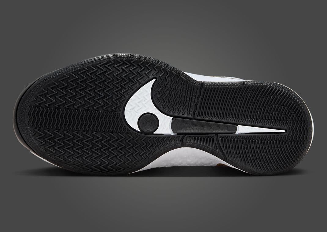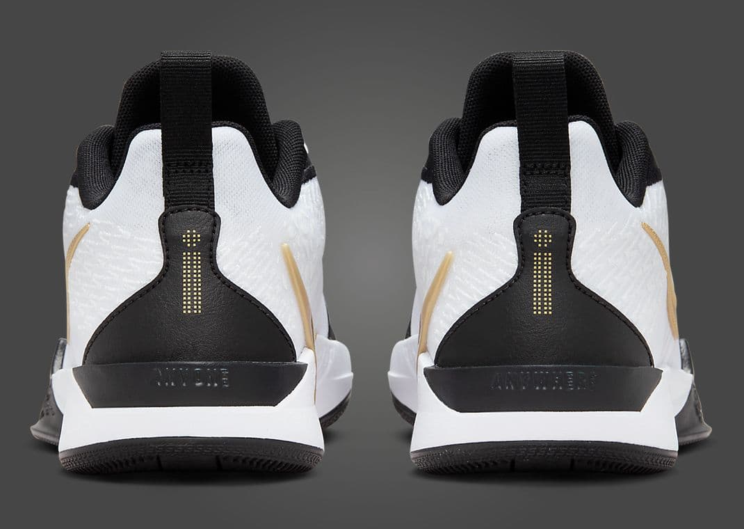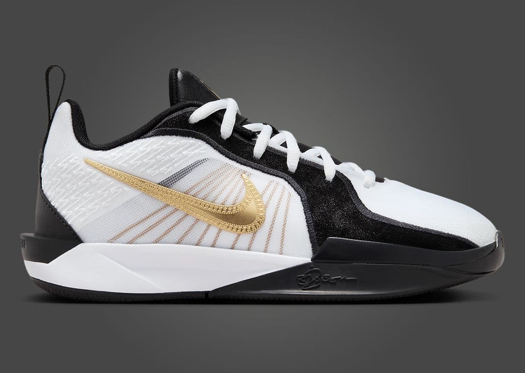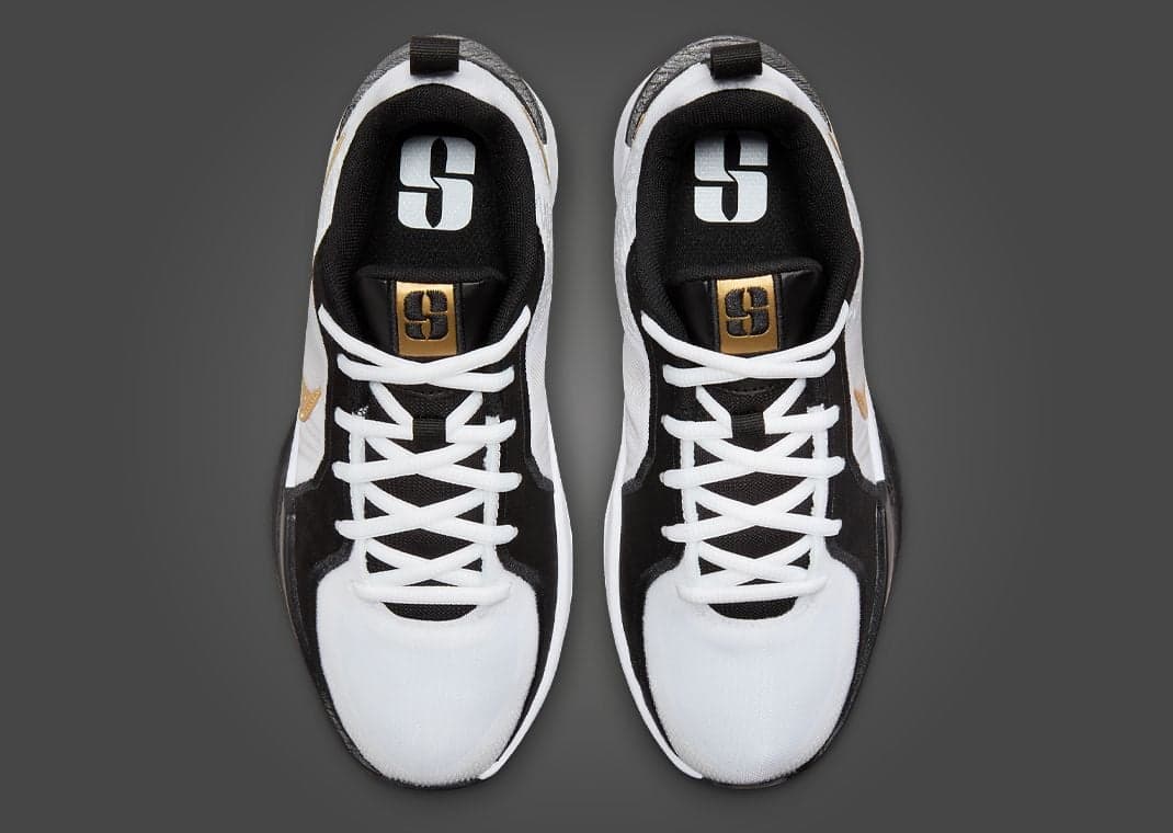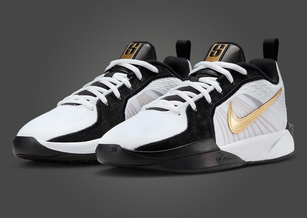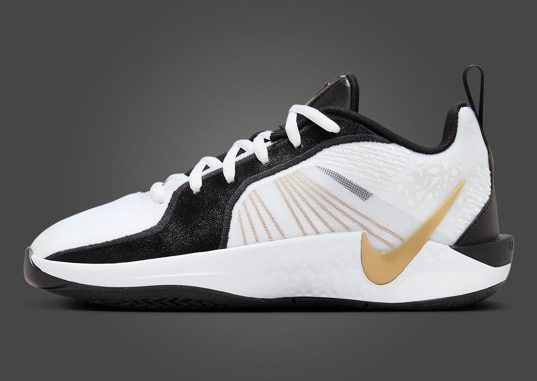Nicknamed Gold Quest, this Nike Sabrina 2 (GS) comes in black, metallic gold, white, and anthracite. Black accents help to tone down this white-based design. The shoe's star is the metallic gold detailing seen via the S logo on the tongue, Swoosh on the sides and medial heel, branding on the back heel, and Flywire. A split white-and-black midsole sits atop a solid black rubber outsole, finishing off the design.