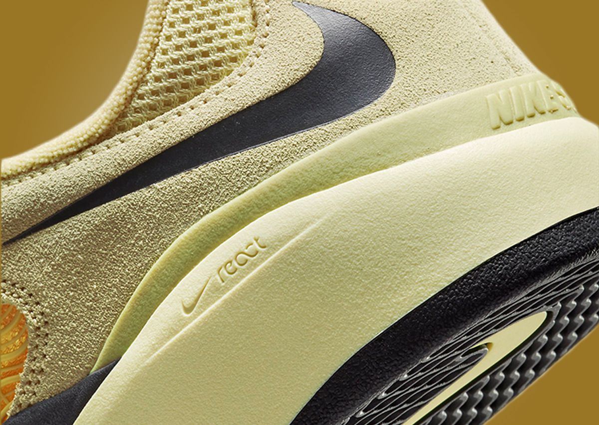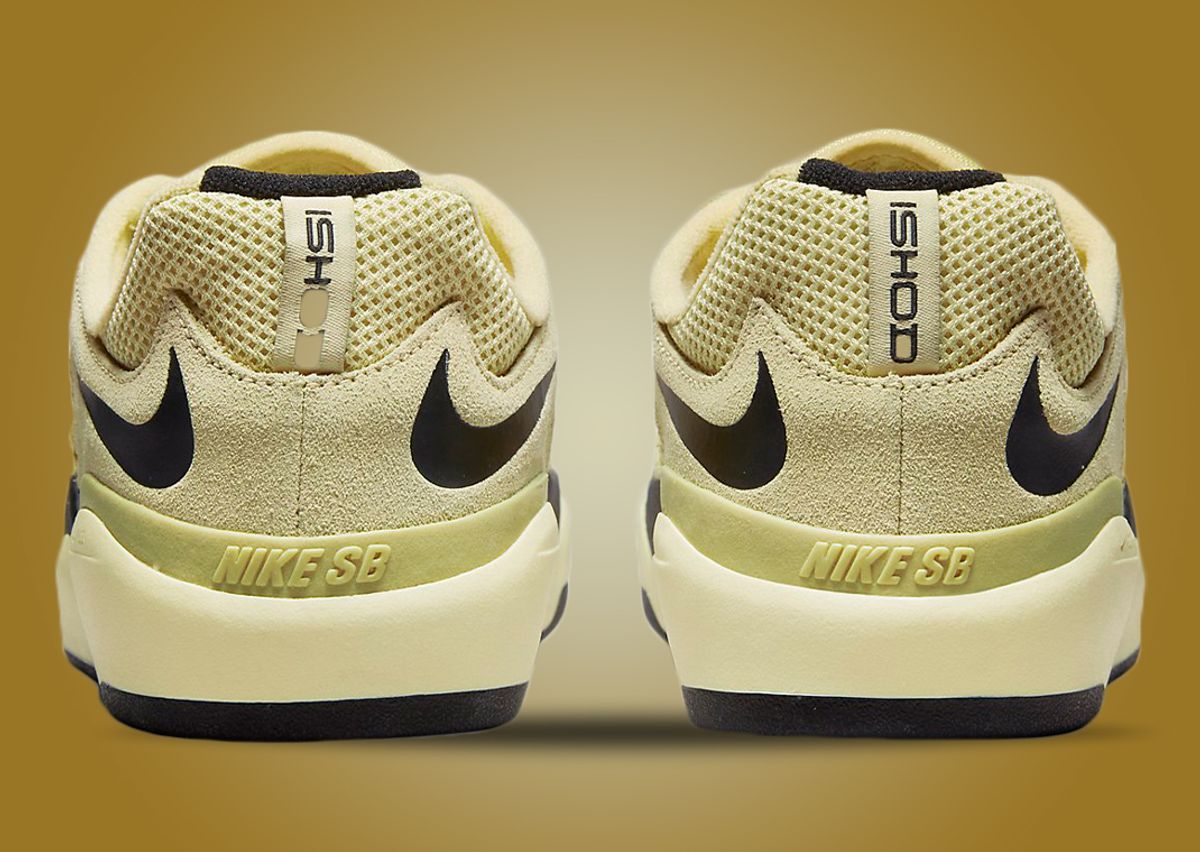No, those plastic panels are not yellowing due to age. Lemon Wash suede covers much of the shoe, as the wavy panels of plastic on the quarter panel and tongue are yellowed out as well. Black branding can be seen throughout the shoe, including the small mini swoosh at the toebox and the reverse Nike Swoosh on the heel. There are additional black accents throughout the sneaker, including “Ishod” on the top of the tongue, a small zigzag stitch through the eyestay, and the outsole.