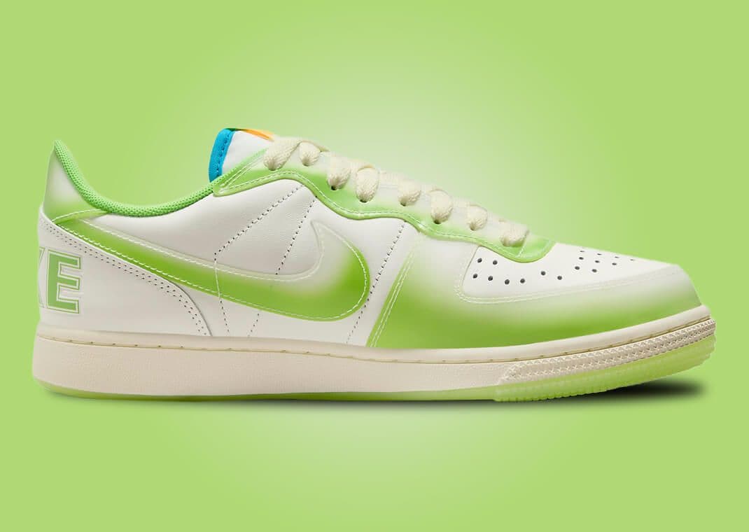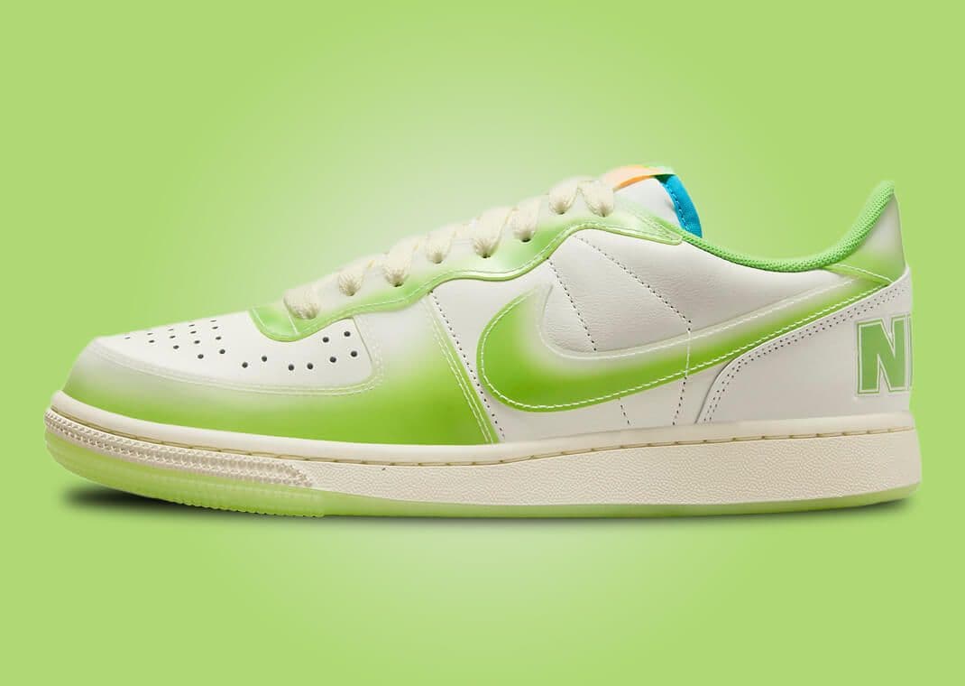 The Nike Terminator Low Sofvi harnesses its inspiration through a beautiful fusion of textures and colors. The model features TPU overlays on the mudguard, eyestays, Swoosh, and heel tab — bringing attention to its glow-in-the-dark details on the Swoosh and "NIKE" heel text. Tumbled leather in a muted cream hue appears on the toebox and midfoot. An energizing green sockliner mirrors the gradient color scheme found on the TPU panels. Underfoot, a sail midsole pairs with a glow-in-the-dark green outsole, creating a cohesive design from top to bottom. Continuing the theme, this pair comes packaged in a custom box mimicking that of Japanese vinyl toys.
