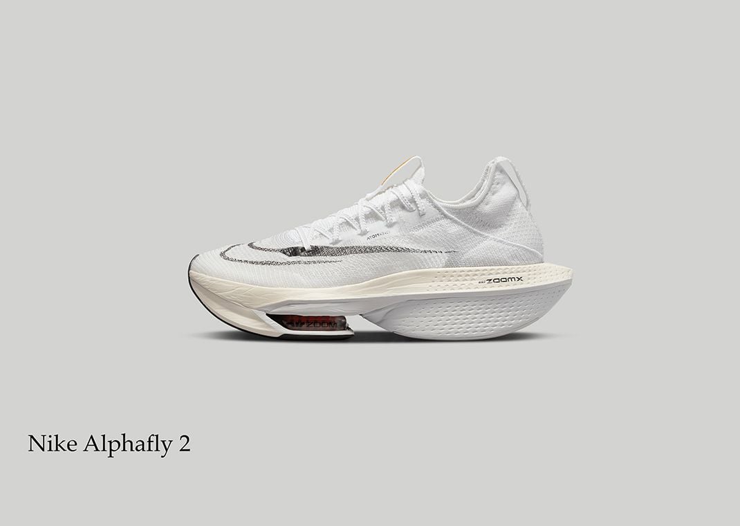 Famed for being banned in competitions, the Nike Alphafly is now onto its second iteration. Designed for marathons and long-distance road races, the revolutionary design features a full-length ZoomX cushion, curved carbon plate, and two Zoom Air pods near the forefoot for a propulsive, comfortable, and efficient ride. For its upper, an ultralightweight version of Flywire (Atomknit) receives an upgrade as its Atomknit 2.0 build adds zonal containment in the forefoot and breathability above the toes. Compared to the previous model, the wider heel portion improves stability and transition. Thinner traction on the outsole reduces the weight of the sneaker and allows for extra millimeters of ZoomX to add even more comfort to the famed sneaker
