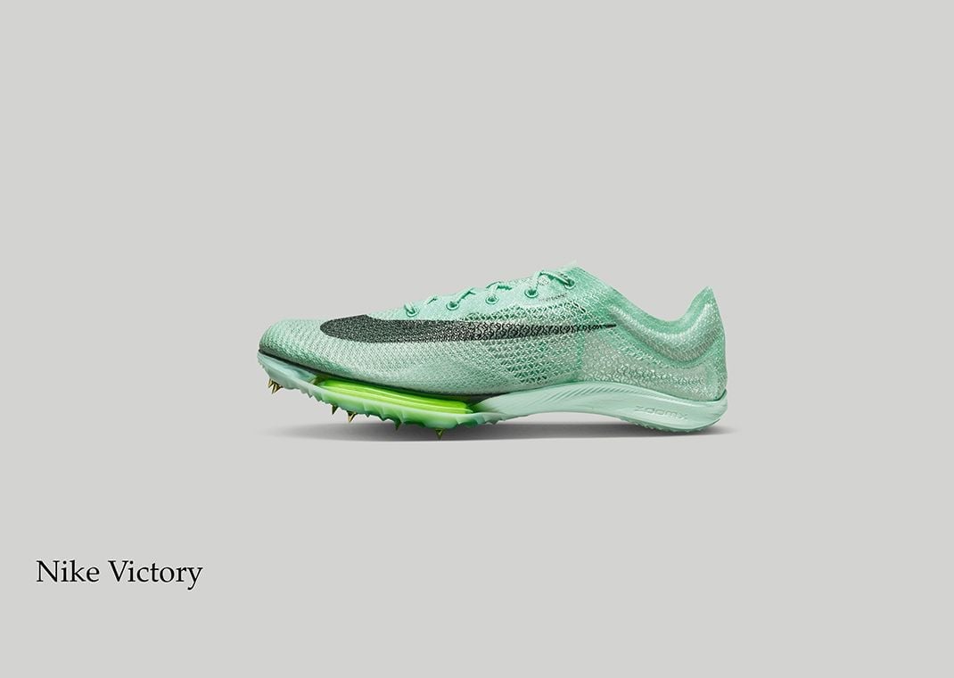 Longer distance runners who participate in track & field, specifically between 800-meter and 5,000-meter races, have the Nike Victory to look forward to. AtomKnit is utilized on the upper while the sole unit features ZoomX foam on the heel and a Zoom Air unit near the forefoot. Embedded within this midsole is a carbon fiber plate for a snappy response with every step. Traction on the rubber outsole features removable spikes and has its pattern placed in all areas of contact for grip from toe-off to finish.
