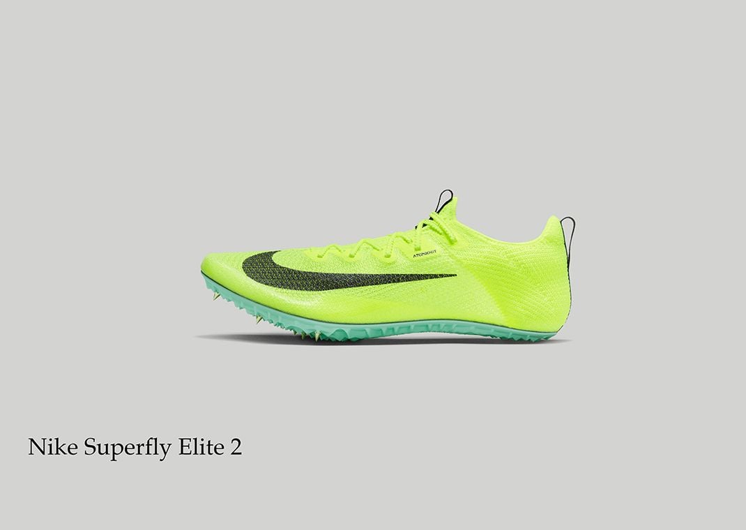 Delivering a generative design for sprinters and hurdlers between 100 and 400-meter races, the Nike Superfly Elite 2 utilizes an AtmoKnit upper that contours to one's foot while providing enhanced breathability. Just like the Maxfly, the outsole features spikes (this time 8) and a shock wave traction pattern designed from NSRL athlete data.
