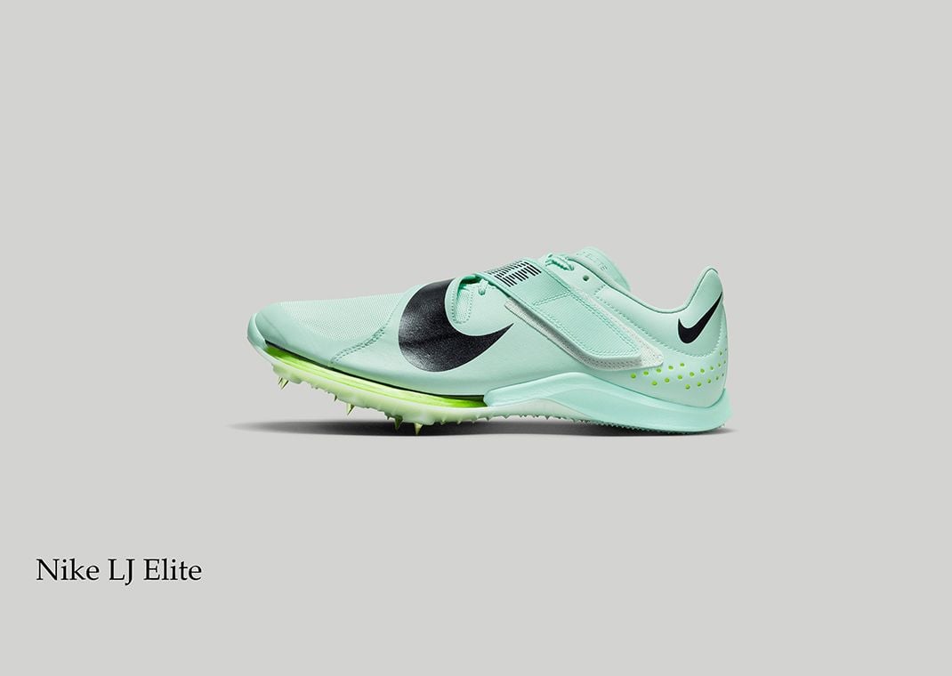 The Nike LJ Elite was designed specifically for those in the long-jumping category. Across its upper sits a woven fabric while thick, compressive molded heel foam adds cushioning specifically for the needs of long jumpers. A cross strap helps with lockdown containment while the sole unit houses a Zoom Air unit at the forefoot and a carbon fiber plate for propulsive and stable takeoffs down the runway.