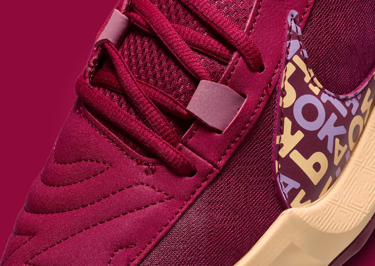 The shoe's exterior features a dark red mesh adorned with an intricate rectangular pattern. The outer panel boasts a Nike Swoosh with letters from Giannis' last name scrambled in peach and berry hues, creating a playful yet meaningful design. On the inner panel, a smaller berry-colored Swoosh subtly enhances the aesthetic. The shoe's upper is constructed from noble red leather, stitched with patterns reminiscent of previous Zoom Freak 5 releases. Leather eyelets and loops provide a secure fit for the laces, which will come in noble red and desert berry, offering wearers the option to mix and match laces.