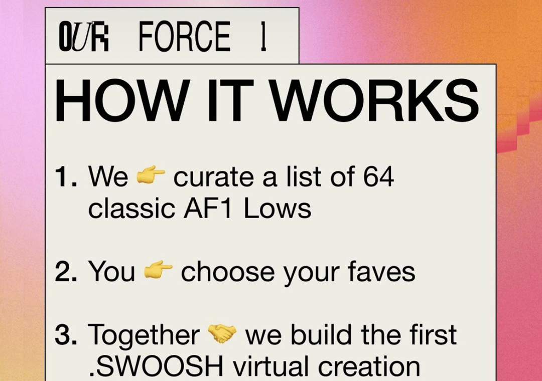 2022 saw the meteoric rise and eventual fall of the crypto, NFT, and web3 marketplace. Various scandals from companies that were seen as trusted institutions like FTX have caused uncertainty amongst consumers and investors alike. Big brands like Nike are approaching the web3 world with a slow burn through the company RTFKT which has released a handful of NFT collections and eventually will see its own Cryptokicks IRL sneaker hit shelves in the near future. Continuing to expand into web3, Nike’s .SWOOSH platform is beginning to roll out to beta users and the inaugural project on the platform is beginning today - Our Force 1.