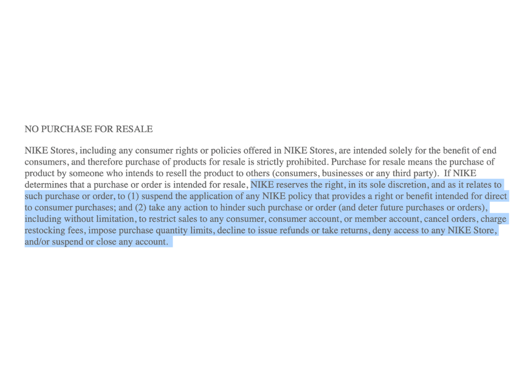Really breaking things down, Nike’s policy does not explicitly state you CANNOT resell their products, but that they CAN refuse sales to customers who they deem to be purchasing for resale purposes.