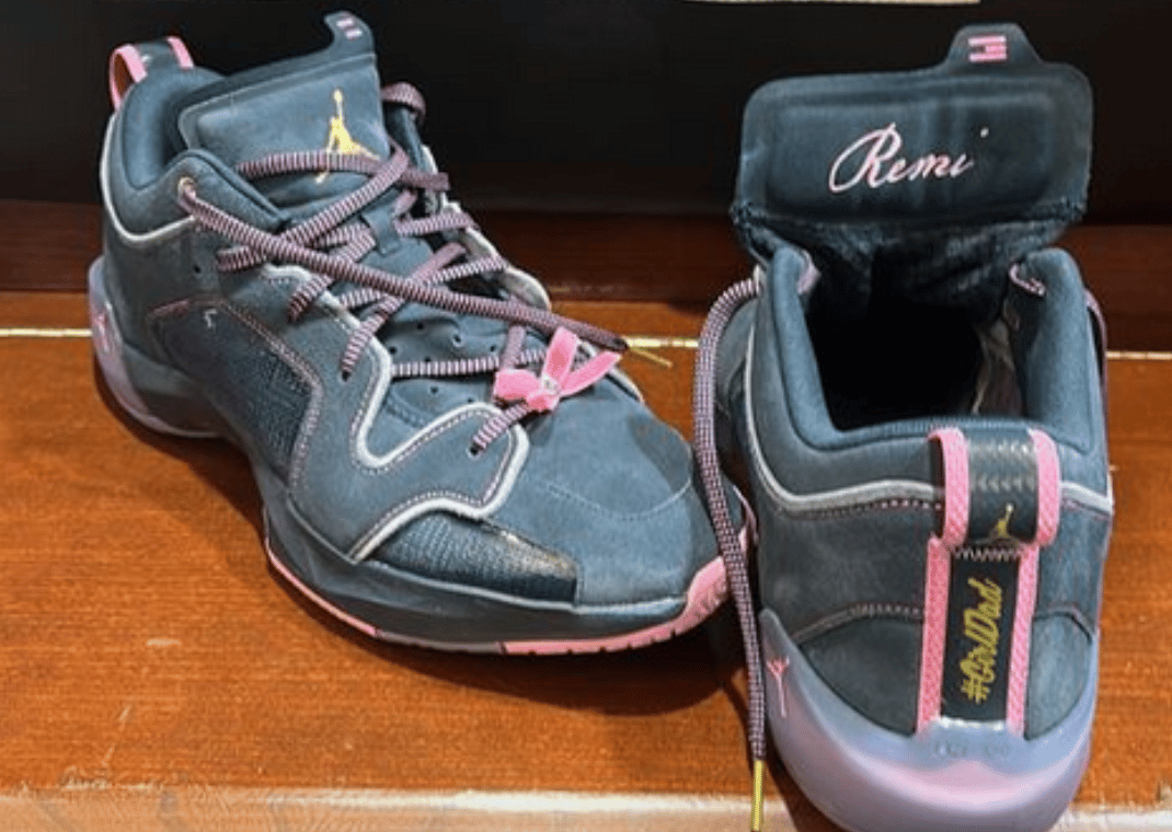 Shared via an Instagram story post, Obi showcased a black AJ 37 Low that features accenting hits of pink and gold throughout its design. Suede panels take over the toe, tongue, and midfoot overlays while Leno-Weave lands in its usual spot on the mid-foot’s underlay. Two-tone pink and black laces pop along the tongue while we see gold details on the Jordan branding details and lace aglets. This color continues onto the pull tab, swapping out its usual MJ signature detail for “#GirlDad” branding. Other added details include a pink bow attached to the laces and Obi’s daughter's name (Remi) placed on the lining of the tongue. Rounding out the design is a black AJ 37 midsole with a semi-translucent pink hit on the heel and a pink and black rubber outsole.