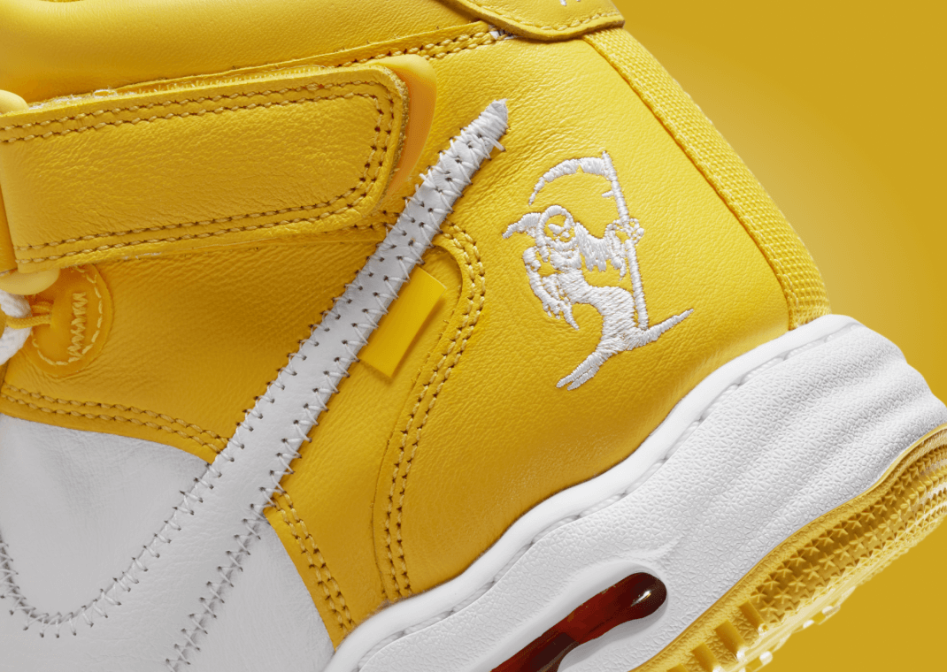 The iconic Off-White branding, displayed in Helvetica font, stands out on the medial midfoot. At the same time, an embroidered grim reaper logo adorns the lateral side, adding an unexpected touch to the design. The midfoot Swoosh proudly bears extra stitching details, and the instantly recognizable Off-White zip-tie is harmoniously integrated with a tonal yellow shade. Underfoot, the sneaker is rounded off with a reworked AF1 sole unit. The heel section of the sole is distinguished by its wavy finish and an exposed Air unit, culminating in a partially spiked yellow rubber outsole.