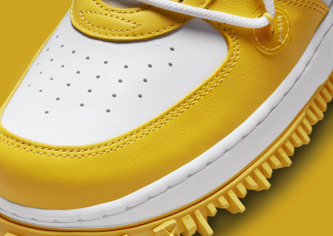 This striking new rendition of the AF1 Mid by Off-White embraces a two-tone color scheme of white and varsity maize. Echoing the same construction as the "Pine Green" variant, the “Varsity Maize” pair features an all-over leather finish. Yellow hues delicately wrap around the mudguard, eyestays, collar, lockdown strap, and heel, setting a bold contrast to the pristine white that graces the toebox and midfoot. The design introduces an additional lace set that encircles the upper in white, setting off the standard yellow lace set running along the tongue.