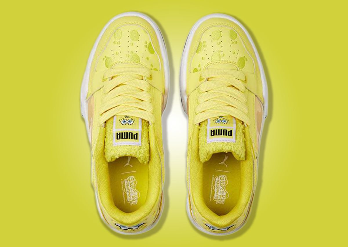 Taking the color palette of Spongebob and applying it to the Puma Slipstream, the silhouette takes on a leather, terrycloth, suede, and transparent TPU construction throughout its design. Along the toebox, circular embroidery in a tonal yellow mimics the holes found on Spongebob while the tongue features a terrycloth, sponge-like construction that is complemented by tonal yellow laces. On the Puma-branded tongue tag, we see a depiction of Spongebob Squarepants with more hits of the show and its main character found on the co-branded insole and via a debossed graphic on the heel tab. Rounding out the upper is the Puma Formstrip that comes with an actual sponge behind a transparent TPU overlay while the entire sneaker is rounded out by a white midsole paired with a brown rubber outsole.