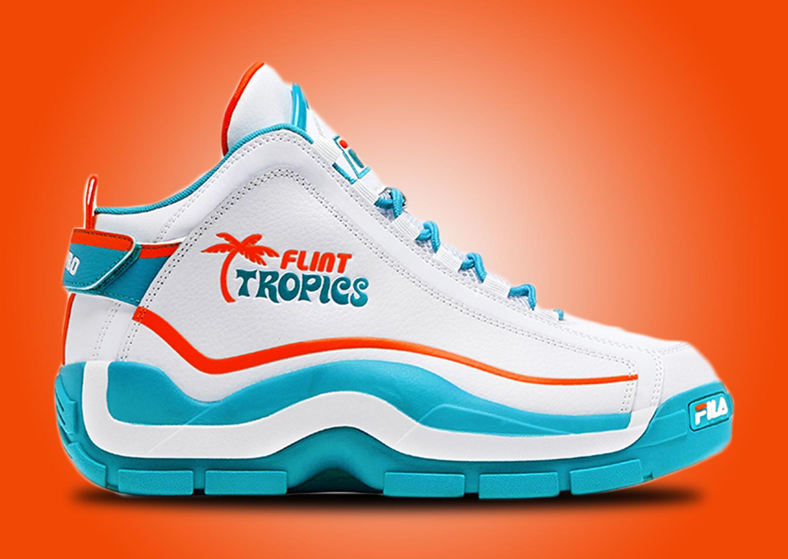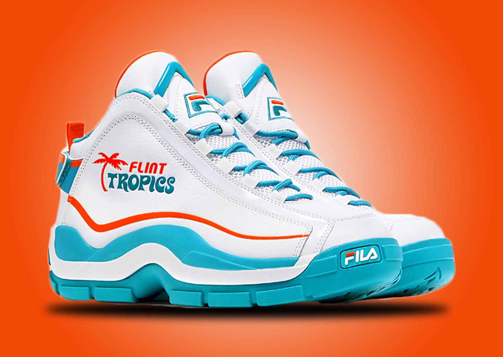 You couldn’t represent the team with just sneakers, so Fila has cooked up matching apparel representing the Jackie Moon-owned team. Featured in the collection, an aqua blue hoodie with co-branded Flint Tropics, Fila, and Semi-Pro branding matches the white and aqua blue shorts that feature similar logos to the hoodie. For a more casual approach, a Jackie Moon-branded t-shirt with his number 33 on the back comes in all white while the graphics take on the aqua blue and orange hues of the Flint Tropics.