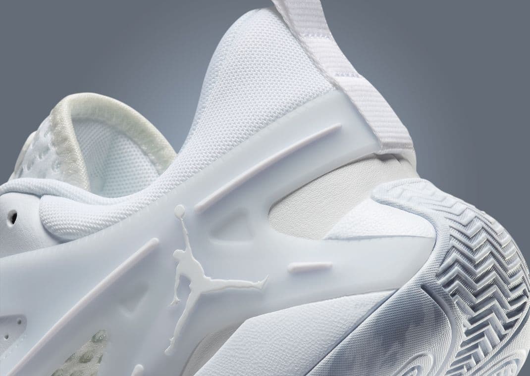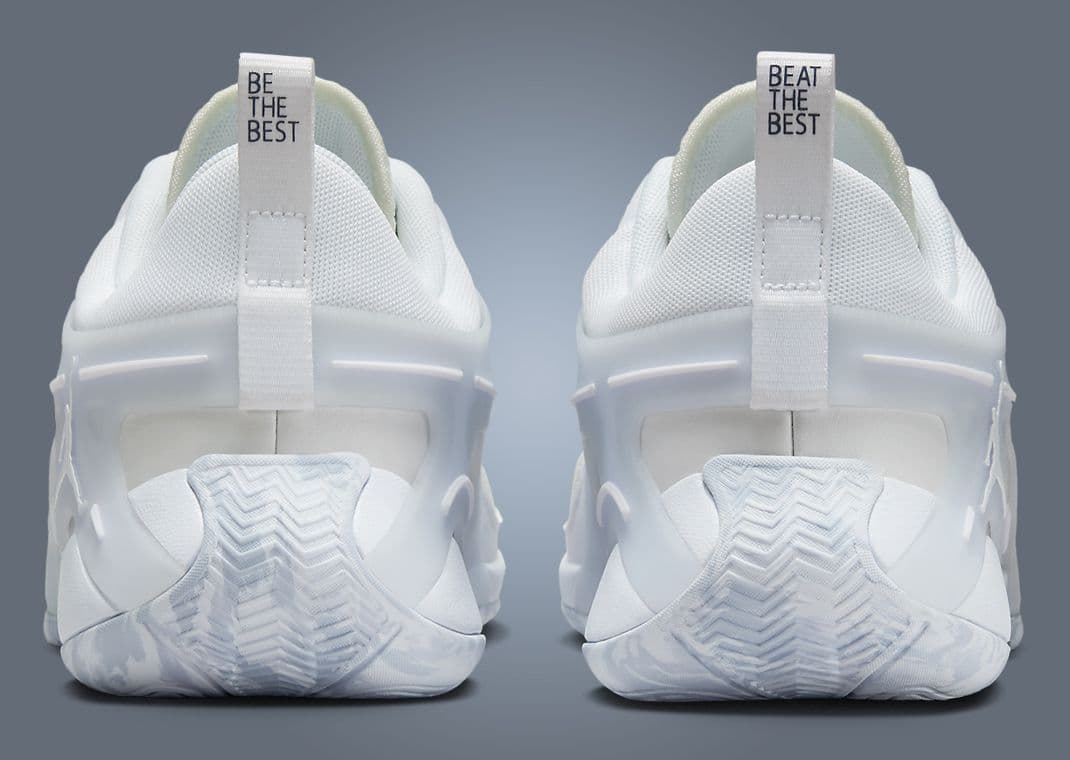 The Shuyu Yang x Jordan Heir brings a blend of style and performance. The sneaker's upper features a mix of mesh materials, with sail hues dominating the toe and lower midfoot, creating a sleek and refined look. Reinforcing these areas are leather overlays that add durability and support. A standout feature is the large white TPU panel, which covers portions of the vamp, midfoot, and heel, adding a modern touch to the design. The sneaker's tongue hosts split branding, with the iconic Jumpman on the right and Shuyu Yang's branding on the left, emphasizing the collaborative nature of this release. The heel pull tabs carry inspirational phrases, with Be The Best on the left pair and Beat The Best on the right, reflecting Yang's competitive spirit. The look is completed with a white foam midsole for cushioning and a marbled rubber outsole that provides traction on the court.