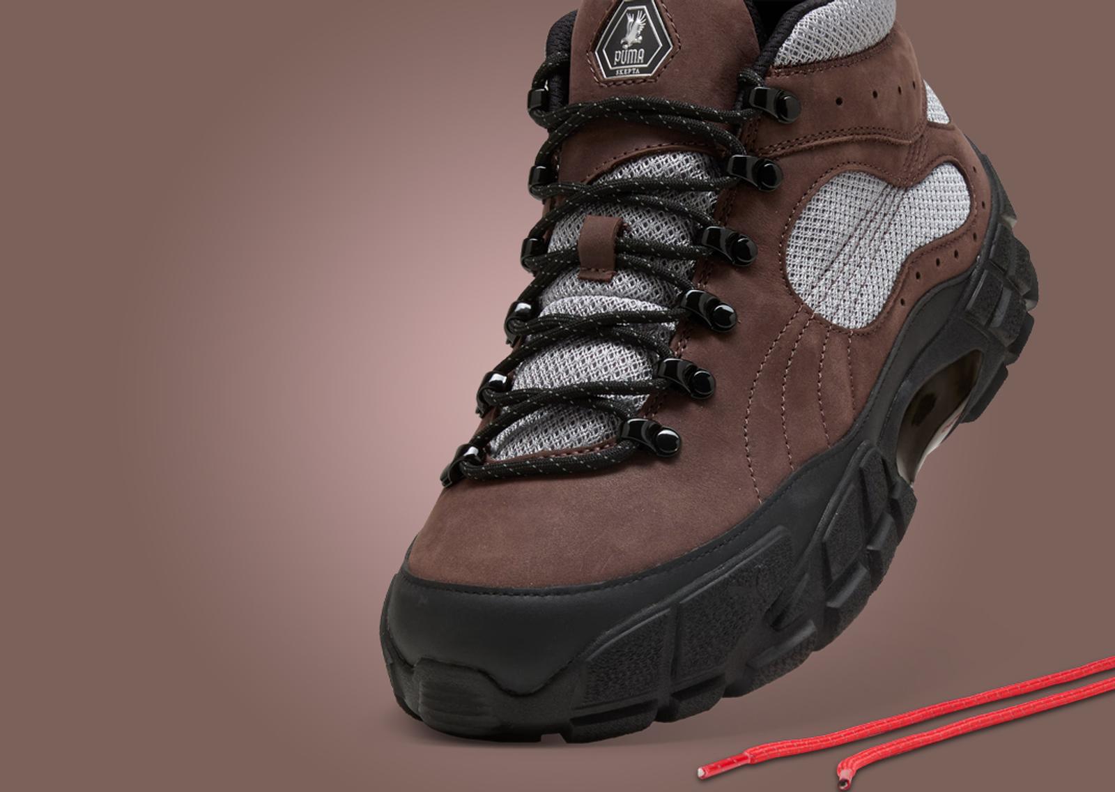 Brown suede details cover a large chunk of the model, starting at the toe and working back over the midfoot, collar, and tongue portions. Below this is a grey-silver mesh, seen in a circular-shaped panel on the midfoot, around the collar, the tongue, and the heel. Metallic eyestays, similar to those found on outdoor boots, help keep the black lace set in place, with the laces themselves resting just below the custom Puma Skepta logo. Final details on the upper include a black mudguard near the toe and perforated suede on the medial side. Down below, the chunky rubber tooling from the original Skepta x Puma Forever model remains, featuring chrome details on the heel, midfoot, and outsole.