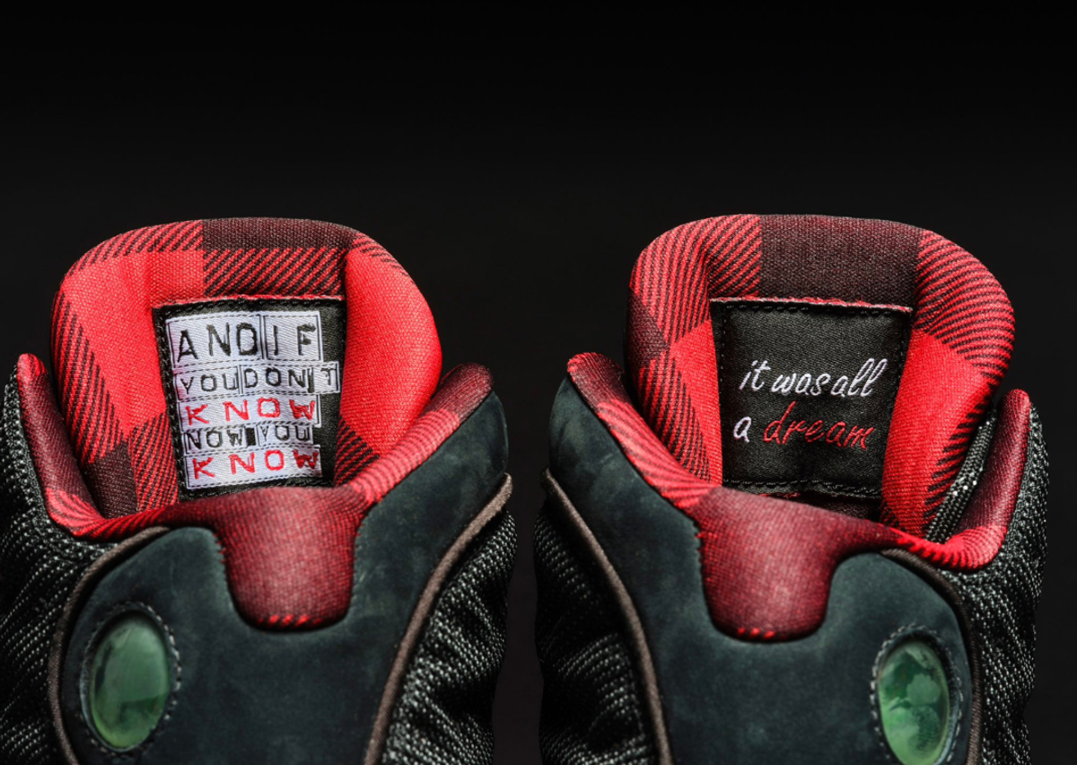 As for the sneaker itself, Jordan Brand went all out on the AJ 13 as the silhouette features premium nubuck throughout its design and the iconic 3M-laden overlay, both of which come in shades of black. Atop the tongue, an embroidery of Biggie himself is present while the lining of the tongue and sockliner comes in a flannel finish. On the reverse of the tongue, lyrics from the ever-popular “Juicy” are added and include the line “If you don’t know, now you know” and “It was all a dream.” The rest of the sneaker keeps its normal details, such as the cat eye that hosts “23” and a Jumpman logo through its lenticular graphic, while the entire design is completed via the black AJ 13 midsole and outsole.
