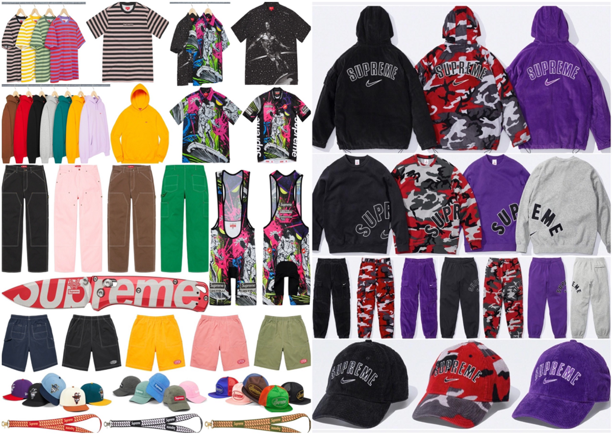 (Supreme Week 14 Droplist) (Supreme/Nike Apparel Lookbook)(Supreme/Nike Arc Corduroy Hooded Jacket)(Supreme/Nike Arc Crewneck and Arc Sweatpants) (Supreme/Nike Arc Corduroy Cargo Pants And Arc Corduroy 6-Panel)(Supreme/Silver Surfer S/S Shirt, Supreme/Castelli Silver Surfer Cycling Jersey, Supreme/Castelli Silver Surfer Cycling Bib Shorts) (Enamel Small Box Hooded Sweatshirt, Reverse Stripe S/S Top)(Double Knee Canvas Painter Pant, Nylon Painter Short)(Washed Seersucker Camp Cap, Washed, Goat New Era, Silk Mesh Back 5-Panel)(Supreme Cuban Links Lanyards, Benchmade Bugout Knife)