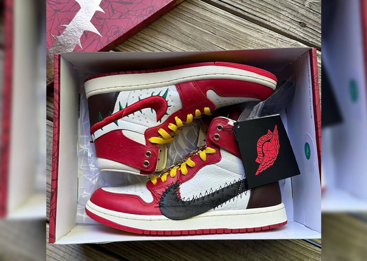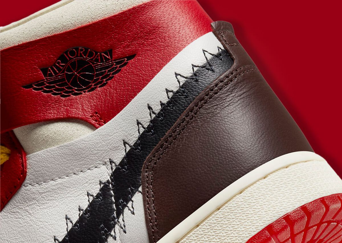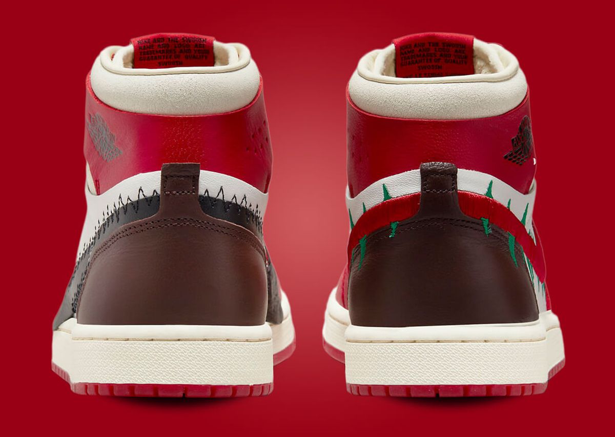 Dubbed "A Rose From Harlem," the Teyana Taylor x Air Jordan 1 Zoom CMFT 2 comes in a gym red, black, summit white, earth, and coconut milk colorway. Featuring a mix of materials and colors throughout the upper. An embroidered Swoosh adorns the right shoe with green thorns sticking out. An elongated, oversized black Swoosh with exposed zig-zag stitching is on the left. The phrase "A Rose From Harlem" is written across the inside of the ankle flaps, with gold hardware on the top eyelets. Custom printed tongue tags come in the form of a Nike Swoosh with thorns on the right and "TEY" written on the left.