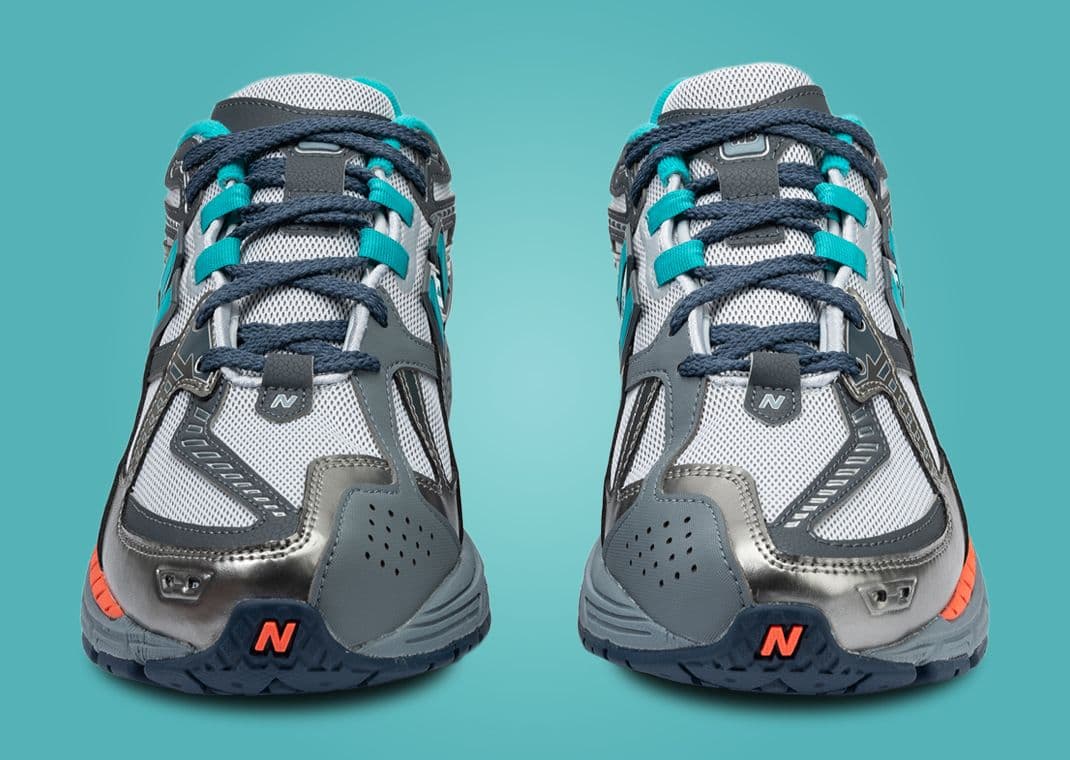 The Grey Blue colorway of The Whitaker Group x New Balance 1906U combines nubuck and leather overlays with a jersey mesh base underneath. The upper is adorned with metallic silver overlays, complemented by blue accents on the panels, the iconic N logo, and the sockliner. The midsole features a blue finish with pops of orange near the toe, adding a vibrant contrast to the overall design.