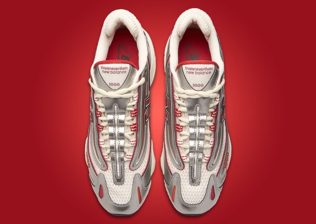 Things remain simple regarding the color palette, with a white base accentuated by metallic silver and red. Leather panels on the mudguard, wavy midfoot panels, and heel come coated in metallic silver, while the lining of the midfoot and heel panels come in red. This vibrant color continues onto the abstract cutouts and embroidered details on the toebox, the lace loops, the N logo on the midfoot, and the 1000 branding near the lateral toe.