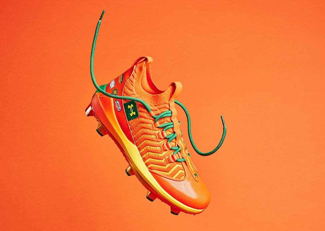 Dubbed Bring The Juice, the cleat pays homage to one of Florida’s most well-known exports — orange juice. The bright orange upper mimics the skin of an orange thanks to the pattern appleid to the patent leather toebox, while the UA IntelliKnit upper takes on a mixture of orange and yellow hues. Green shades, resembling the green leaves that appear on orange trees, are placed on the lace set and Under Armour patch.