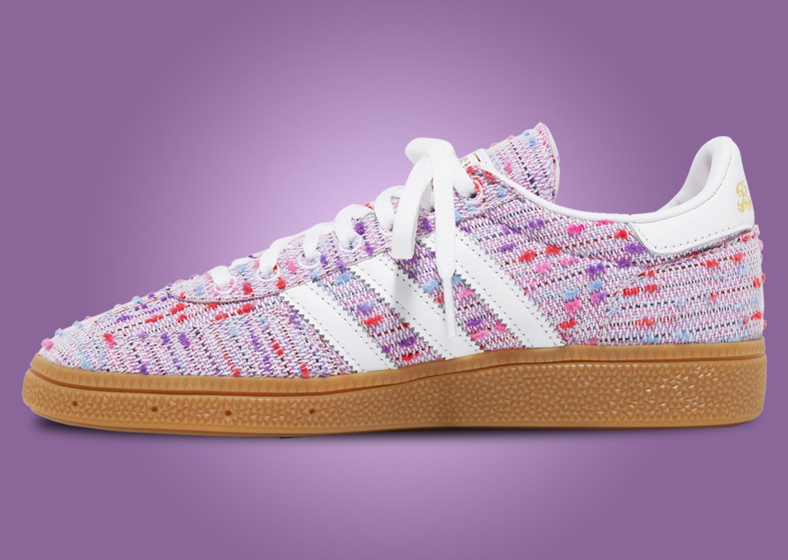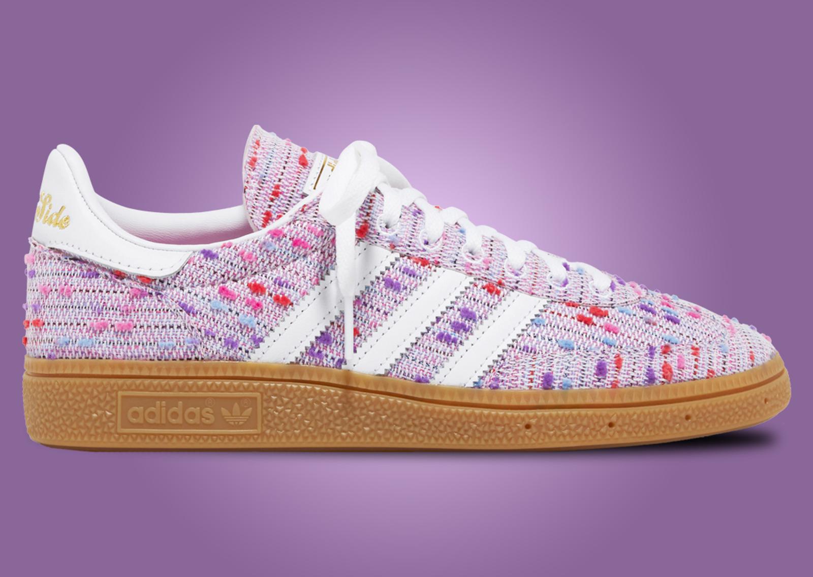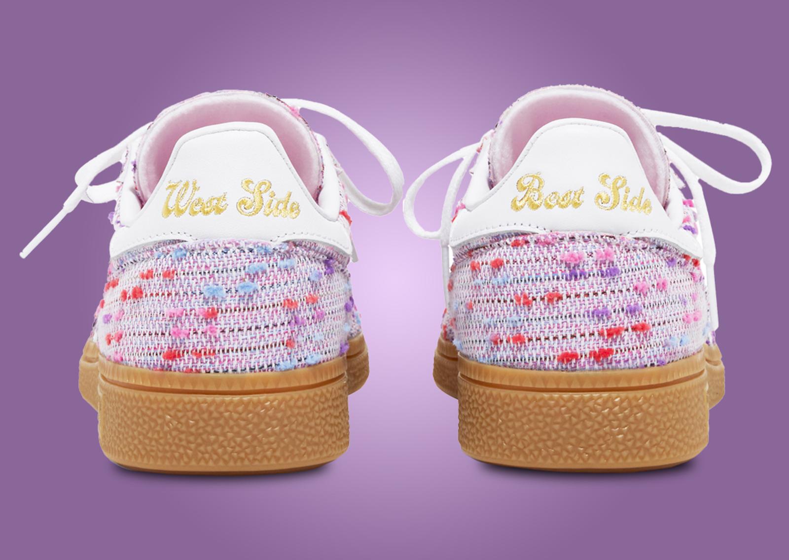 The adidas Handball Spezial kicks things up with a pink-based bouclé upper. The phrase "West Side Best Side" is found across the back heel tabs, embroidered in gold, a nod to the Upper West Side, where West NYC calls home. White leather accents and a gum rubber sole complete the look.