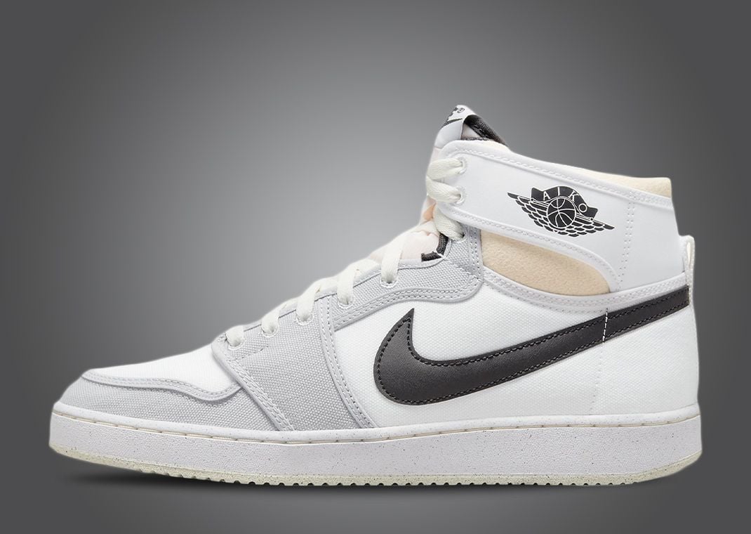 Synthetic leather and canvas take over the sneaker with the latter of the two materials appearing in grey on the mudguard and eyestays while the toebox, midfoot, and heel are covered in white. Synthetic leather appears on the collar in the same white shade as the canvas below, hosting an “AJKO” branded Wings logo in black, complimenting the rest of the branding details seen throughout. More white shades land on the tongue and lace combo while the entire design is completed by a white-on-cream midsole and outsole package.