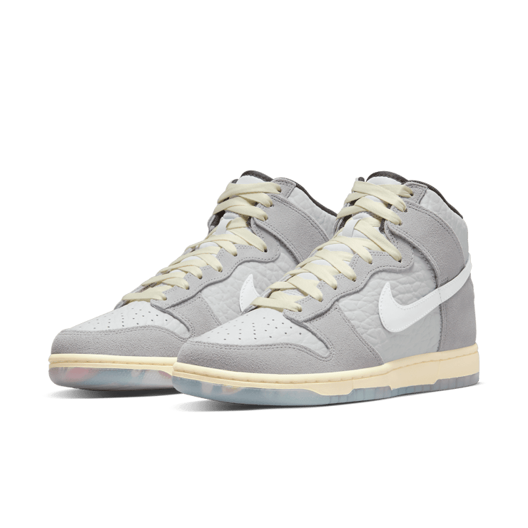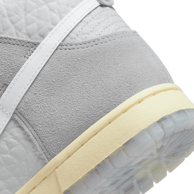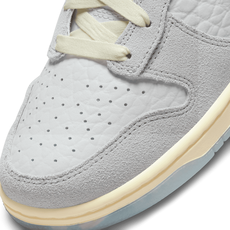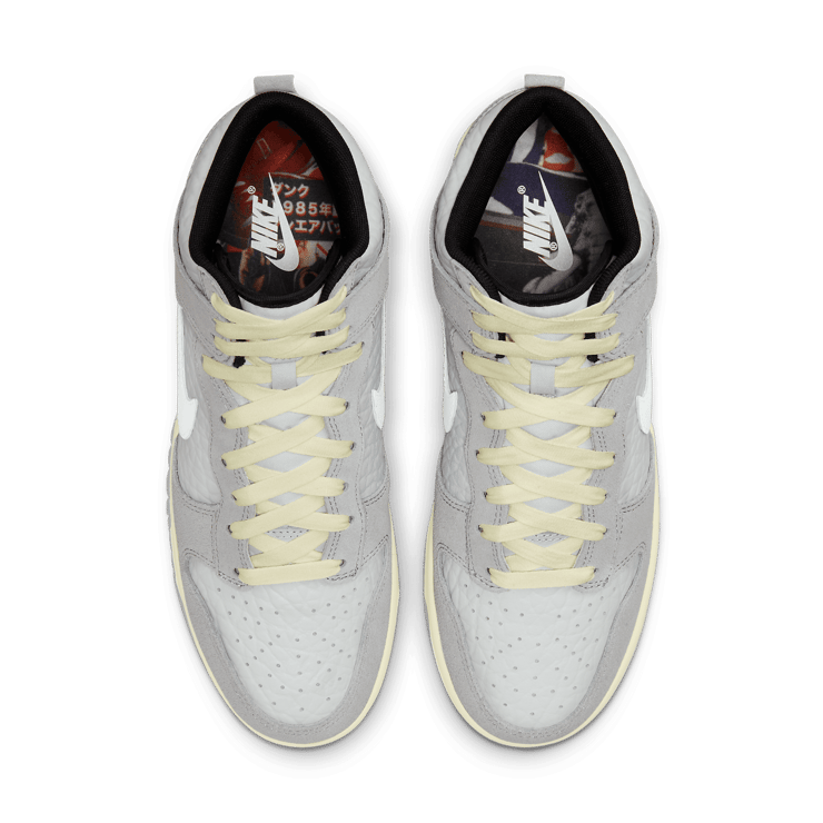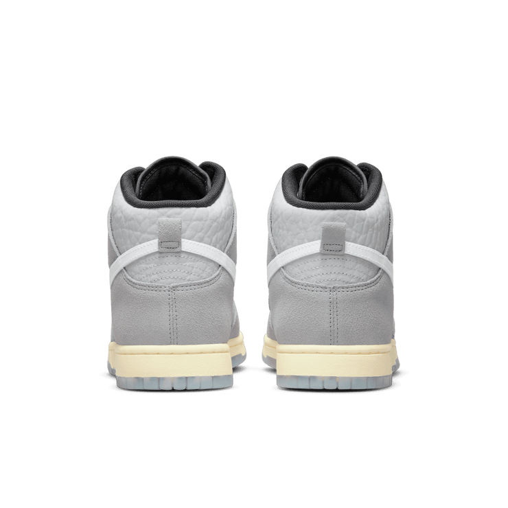 The Nike Dunk High “Culture Day” celebrates the Dunk’s significance to Japanese streetwear and sneaker culture. Grey leather underlays have well-defined pebbles throughout, as a high-quality grey suede is used as the primary overlay on the sneaker. The vintage look of the midsole is a nice juxtaposition to the clear outsole, which features a hodge-podge of various Dunk colorways, signs in Japanese Kanji, and multiple elephants. Coconut Milk-colored laces against the plain white tongue with black piping along the edge give off a stark contrast that ties together the fresh, but vintage vibe of the sneaker.