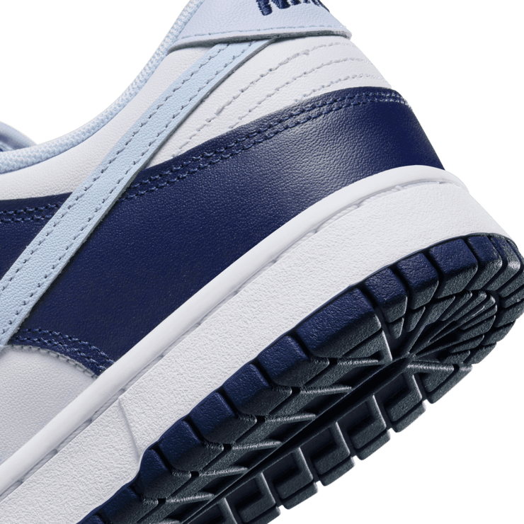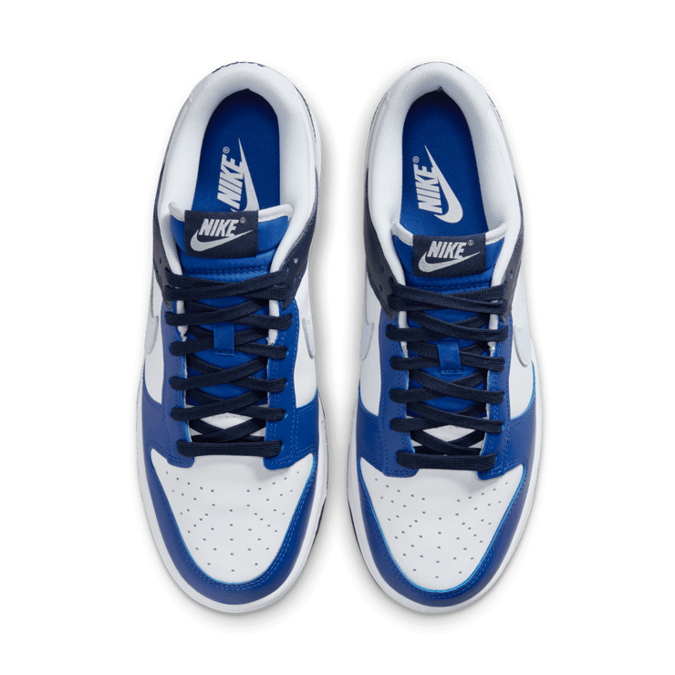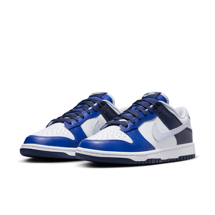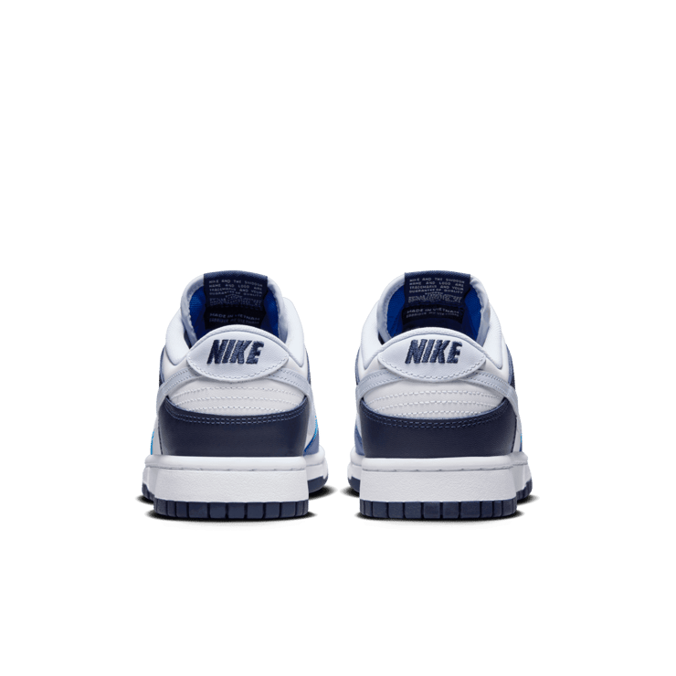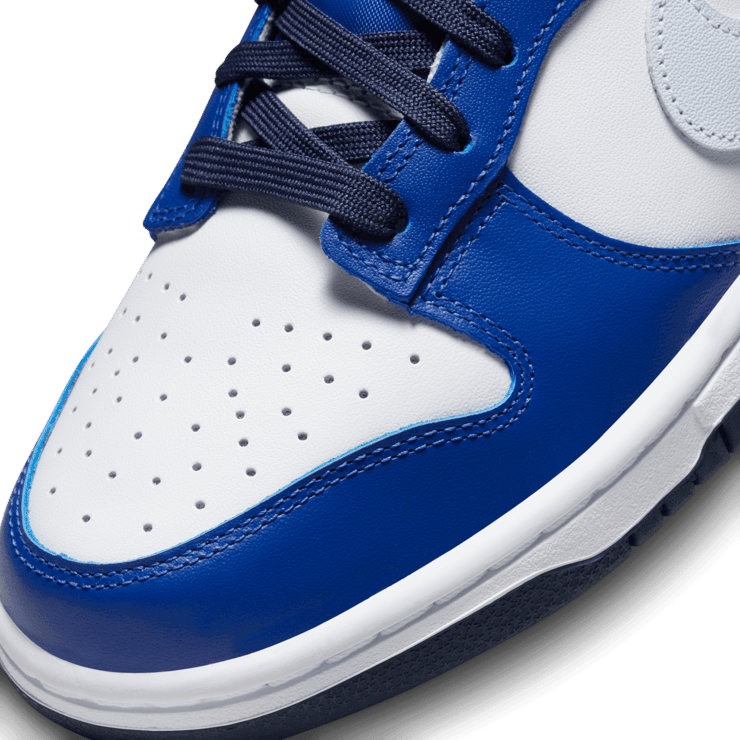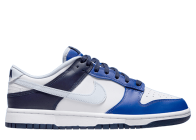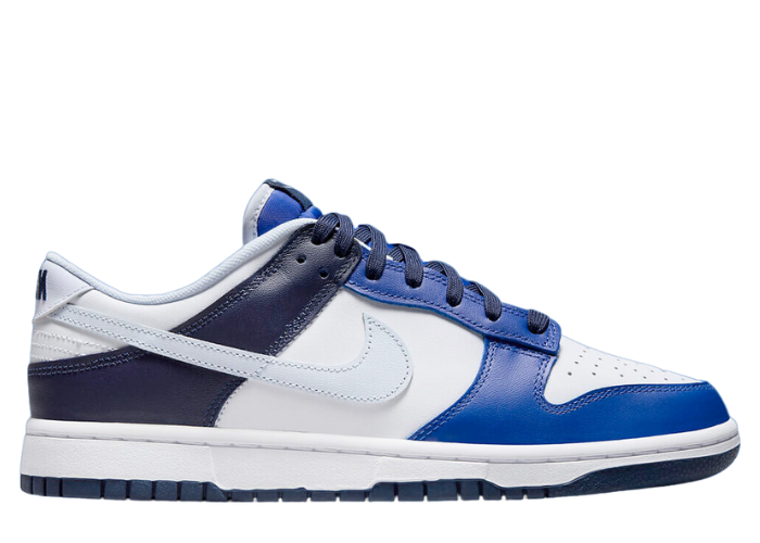 This version of the Nike Dunk Low boasts an all-leather upper, interspersed with various shades of blue set against a contrasting white backdrop. The mudguard, eyestays, and tongue get bathed in an appealing game royal hue. The laces, heel overlay, and tongue tag are treated to a darker midnight navy finish. The base layer stands out in a pristine white, while the Swoosh and heel tab come in football grey. An embroidered Nike logo adorns the heel, similarly dyed in a midnight navy tone. A clean white midsole is paired with a midnight navy outsole, completing the sneaker.