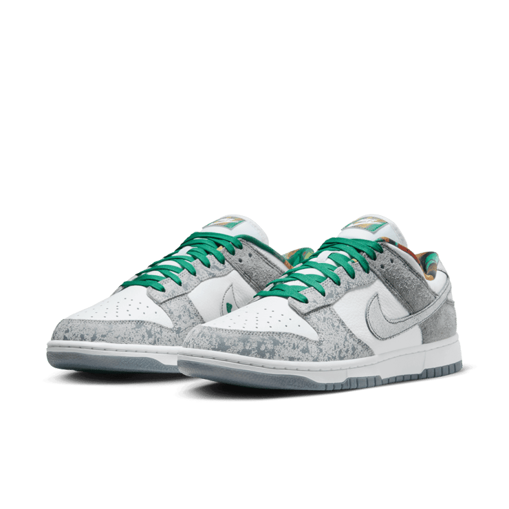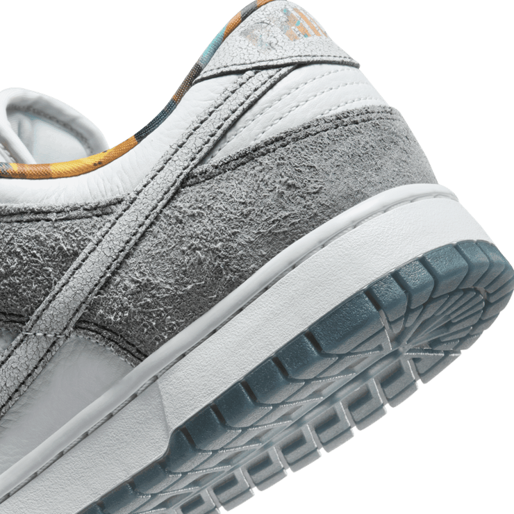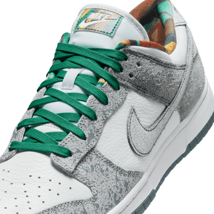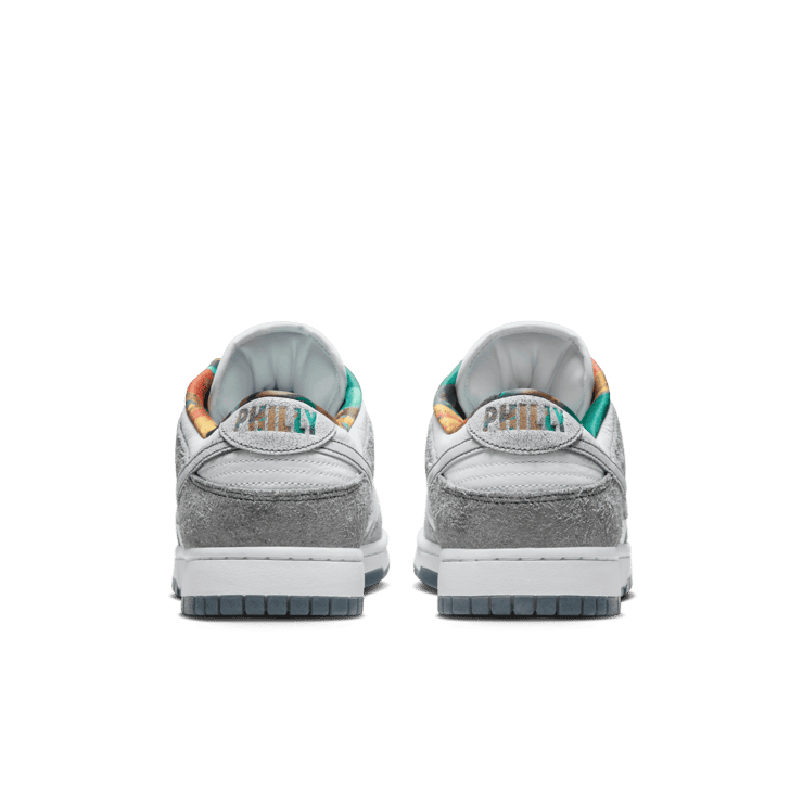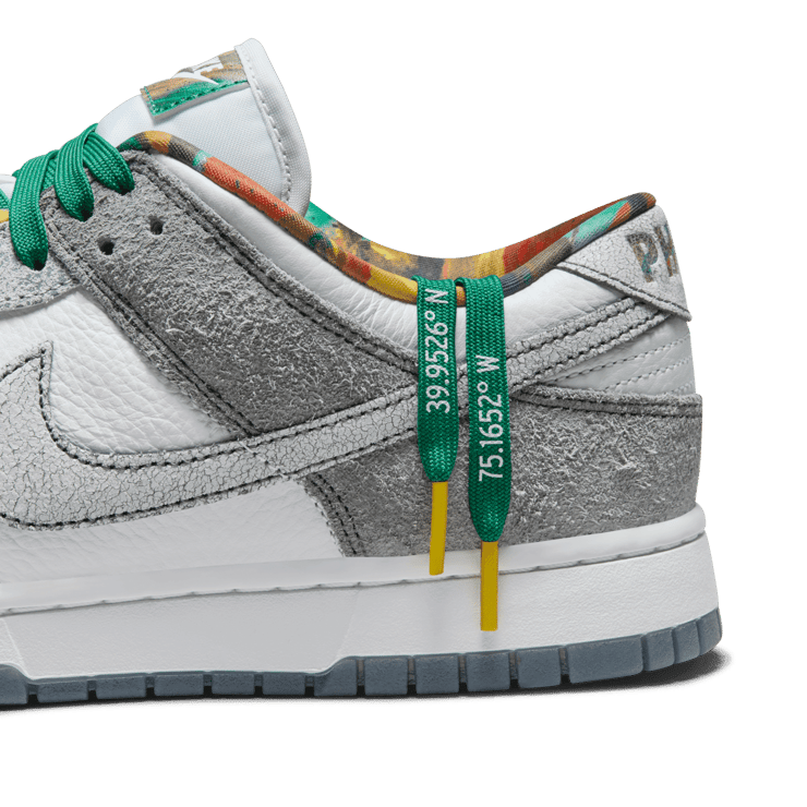 The Nike Dunk Low Philly features clean white leather underlays paired with cracked leather and suede overlays in grey hues, providing a textural contrast that elevates the sneaker's aesthetic. Kelly green accents are present on the lace set, which also includes the geographic coordinates of Philadelphia, adding a personalized touch. The tongue tag and sockliner boast a vibrant multi-color pattern, complementing the Philly branding on the back heel tab. Completing the look is a clean white midsole and a blue rubber outsole, ensuring that the sneaker not only looks good but also offers reliable comfort and performance. In a unique twist, the Philly Phanatic himself will receive a custom pair, highlighting the city's deep connection to its sports culture.