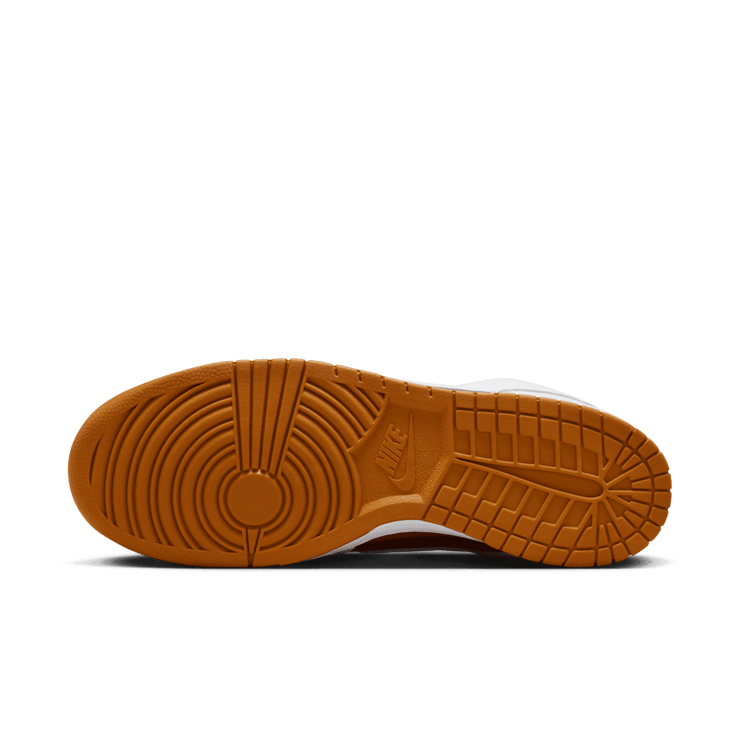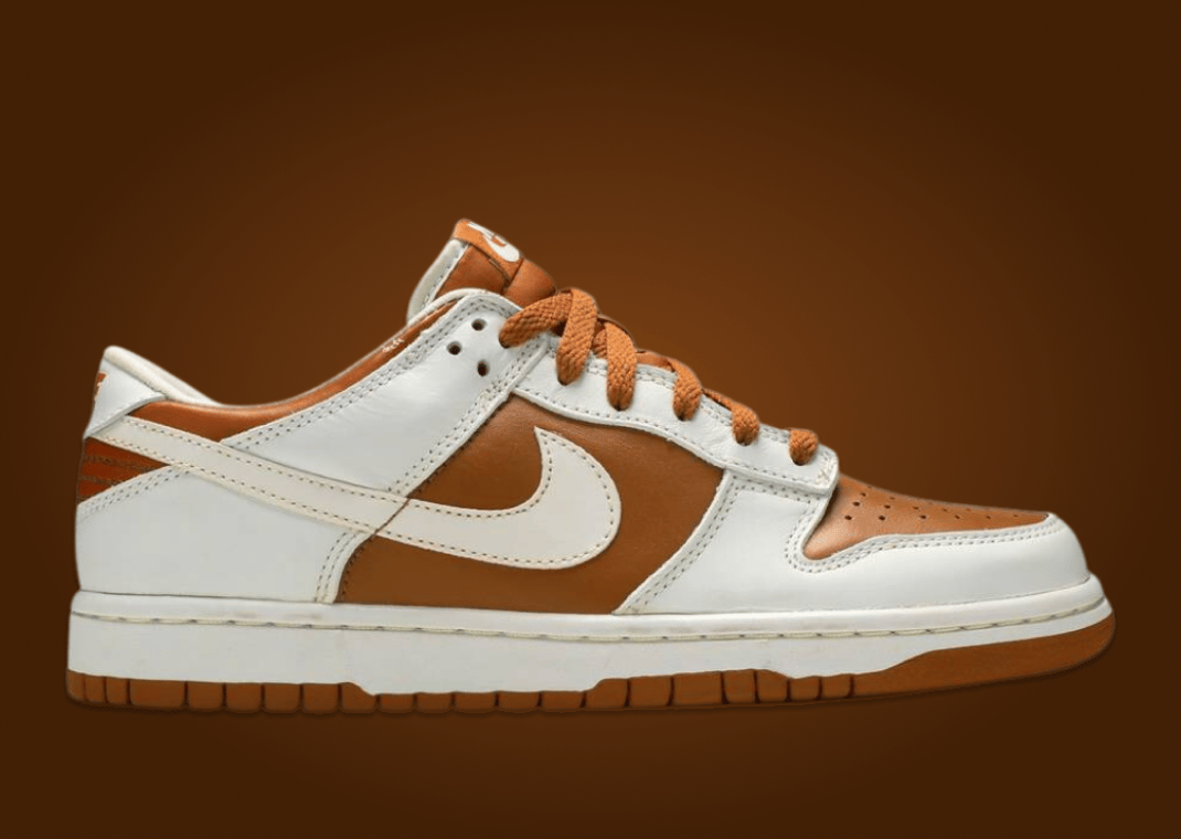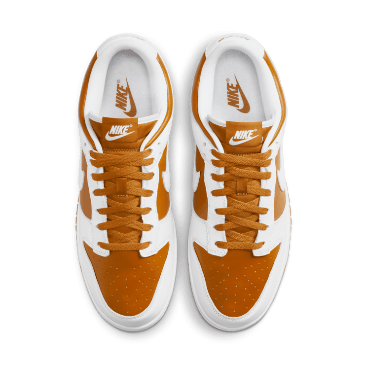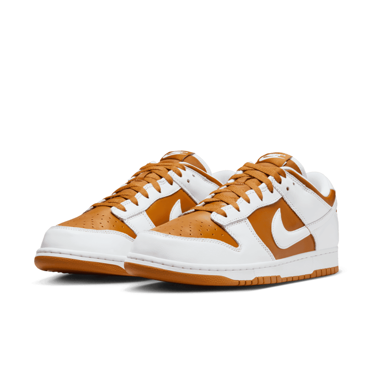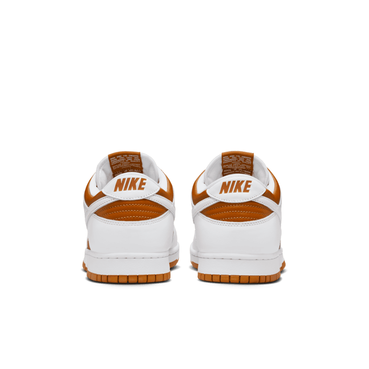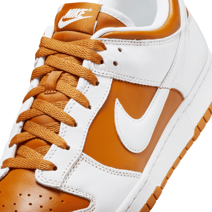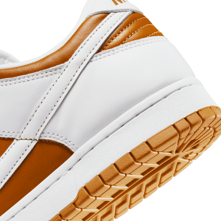 The 2024 Dunk Low Reverse Curry retro incorporates white leather overlays that contrast against the curry-shaded smooth leather underlays. Complemented by tonal laces and a matching tongue, the Swoosh on the midfoot is highlighted in white, while the heel tab sports the "Nike" branding in dark curry. A white midsole and a dark curry outsole sit beneath, rounding off the overall look.
