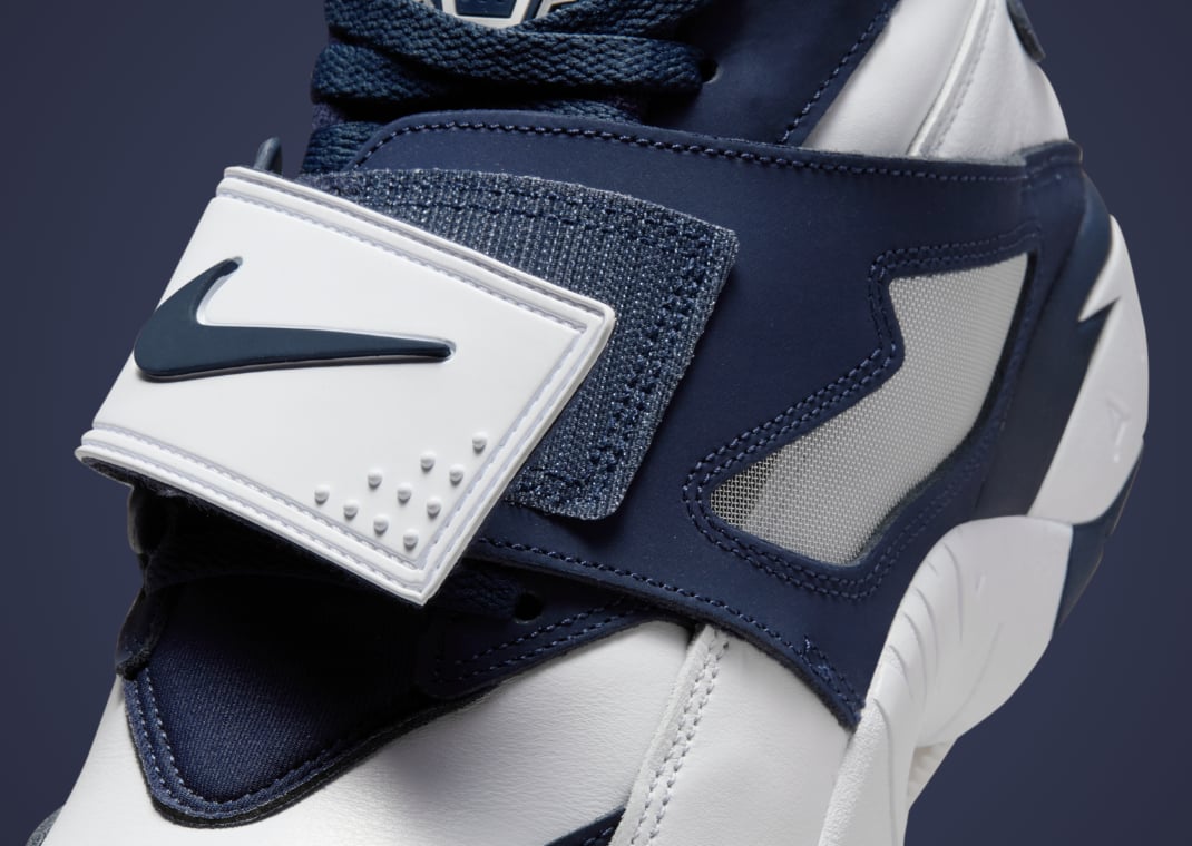 The latest Nike Diamond Turf retro is a re-release of an original colorway, and a callout to Sanders’ days in Dallas. The bulky cross-trainer is draped in blue and white Cowboys colors. Starting with blue nubuck on the toe, the two-tone white and college navy colorway continues with more blue on the tongue, lace panels, forefoot strap, and heel panel. The rest of the upper is done in white leather, with white on the top of the strap and a navy Swoosh popping off it.